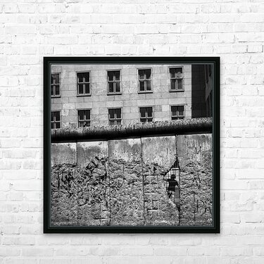 A monochrome photograph of a lone figure dancing captured through a hole in the remnants of the Berlin Wall in Berlin Germany. This striking black and...[+]