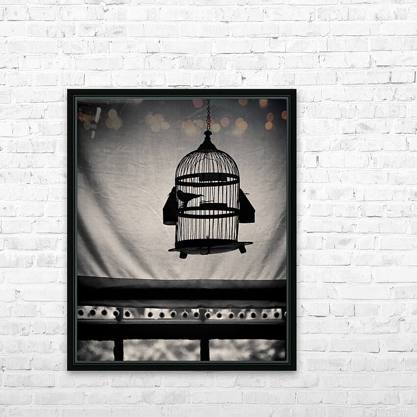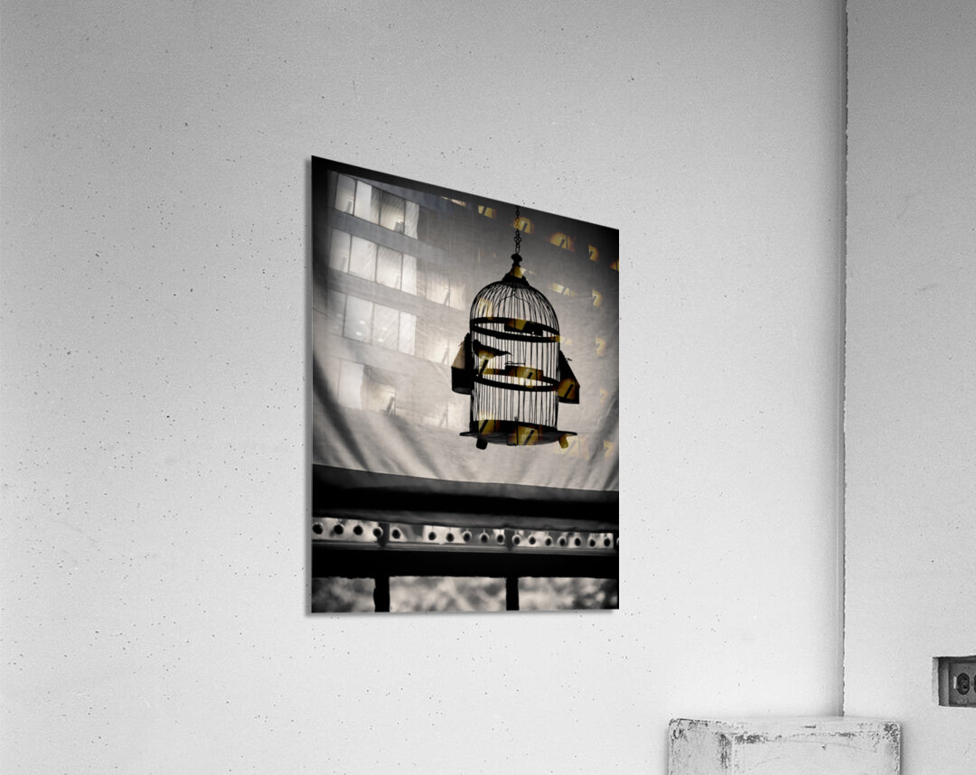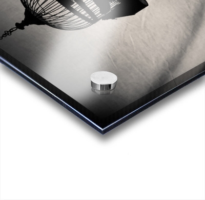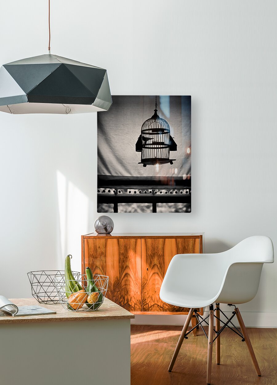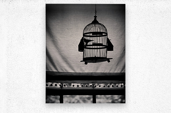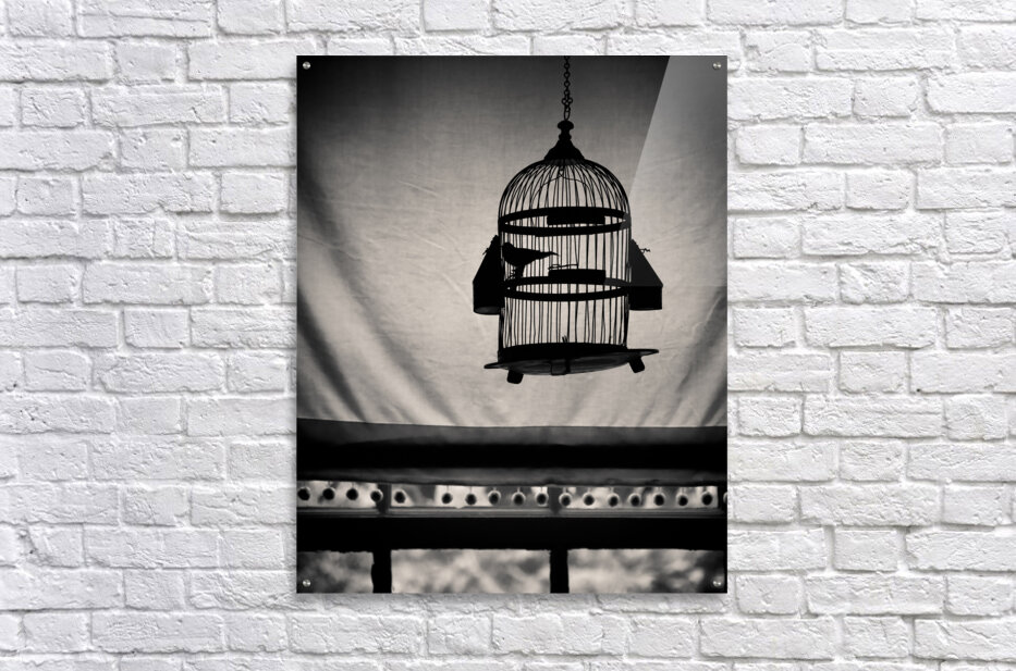 A monochrome photograph of an antique birdcage hanging by the window of an old Dutch farmhouse in the Netherlands. The bird and cage are in silhouette...[+]