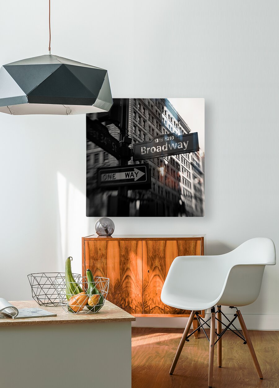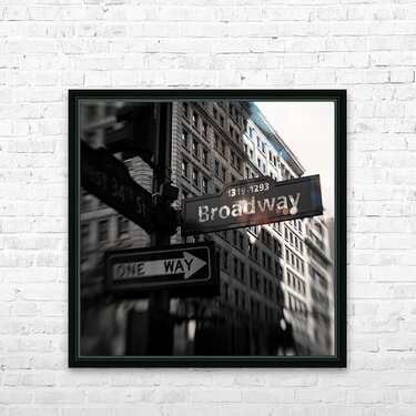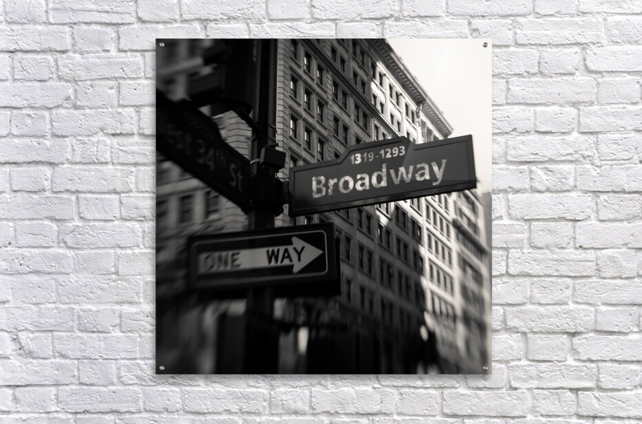 A monochrome photograph of a Broadway intersection sign in New York City USA captures the iconic streets timeless essence. This black and white image highlights the urban landscape with the Broadway sign prominently featured against a backdrop of New Yorks distinctive architecture. The classic contrast of the photo adds a nostalgic feel evoking the citys vibrant history and cultural significance. Ideal for those who appreciate urban photography New York City landmarks or classic street scenes.
