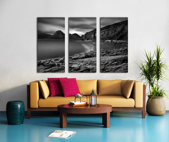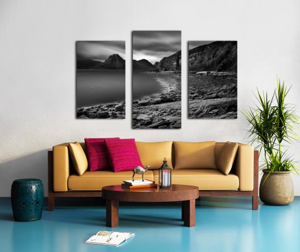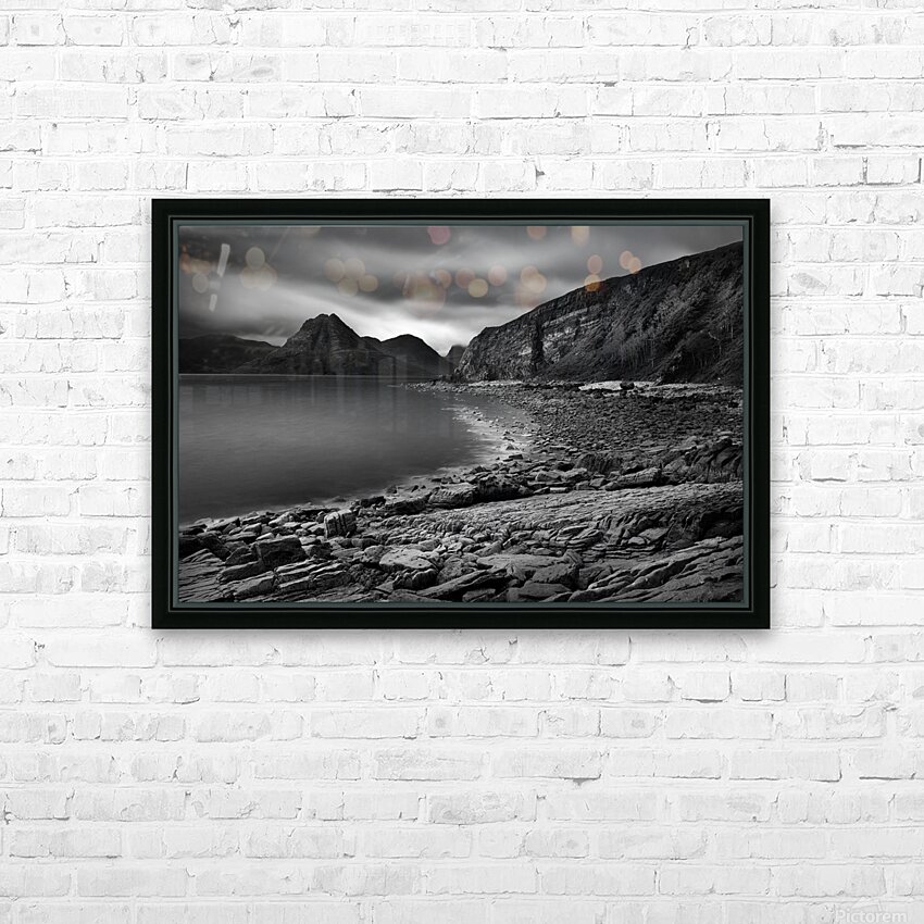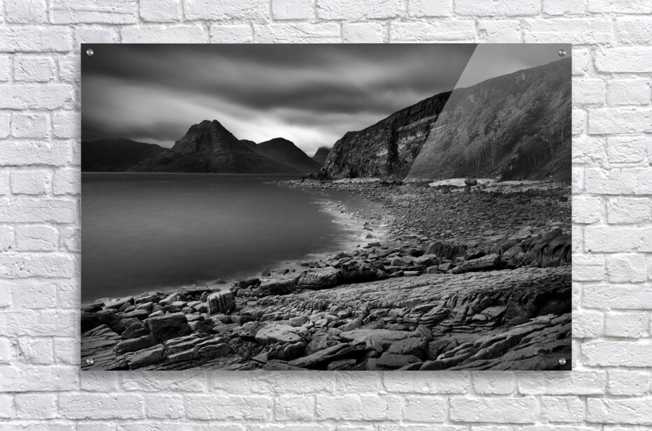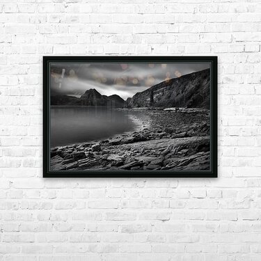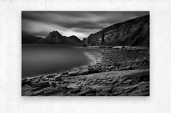 A monochrome long exposure photograph captures the dramatic heavy clouds hovering above the Cuillin mountain range. Taken from the rugged rocky shores...[+]