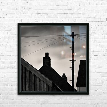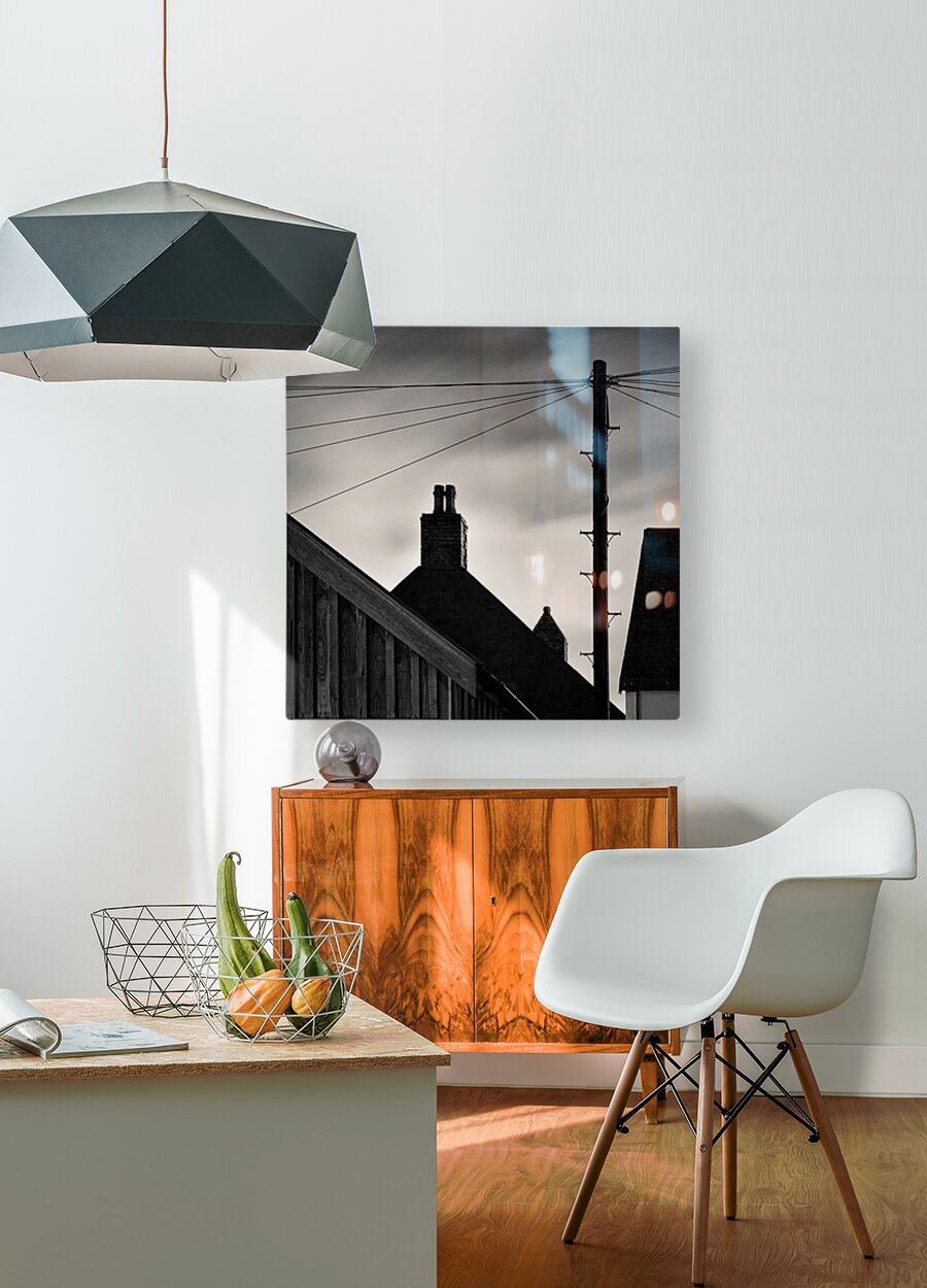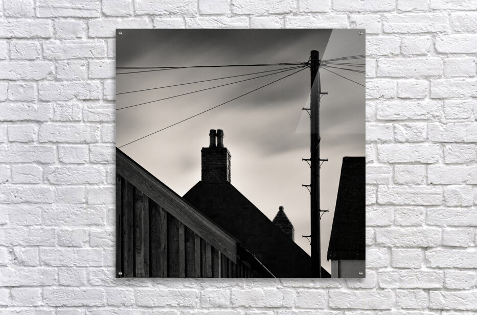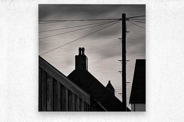 A monochrome long exposure photograph captures the silhouettes of Footdee rooftops at night against a cloudy sky. Footdee also known as Fittie is an old fishing village located at the east end of Aberdeen Harbour in Scotland. This minimalist image highlights the distinctive rooftops chimney stacks and a telegraph pole creating a serene and timeless scene. Perfect for those who appreciate minimalist photography and the historic charm of Aberdeens coastal architecture.