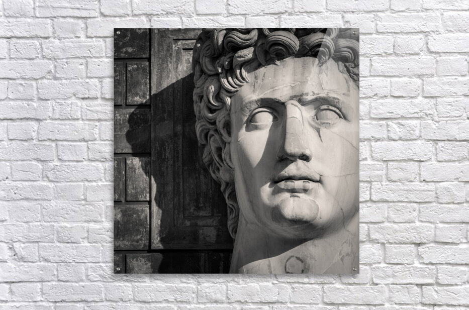 A monochrome photograph showcasing the imposing bust of Emperor Caesar Augustus located in the Cortile della Pigna of the Vatican Museums in Rome Italy. This detailed image captures the grandeur and historical significance of the ancient Roman emperor’s sculpture highlighting the intricate craftsmanship and classical features of the bust. Ideal for history enthusiasts art collectors and anyone with an interest in Roman antiquities and museum artifacts.