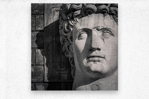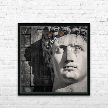 A monochrome photograph showcasing the imposing bust of Emperor Caesar Augustus located in the Cortile della Pigna of the Vatican Museums in Rome Ital...[+]