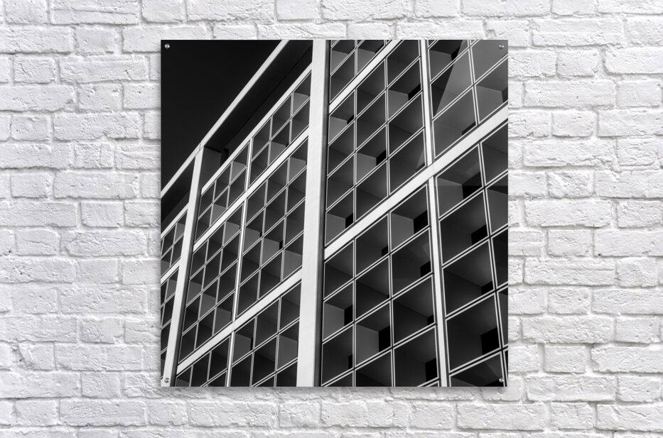 A black and white abstract photograph capturing the geometric patterns of a modern buildings exterior emphasizing the orderly grid of windows. The monochromatic composition highlights the sharp lines and repetitive shapes of the architectural design offering a detailed view of the structures unique patterning. Ideal for contemporary art enthusiasts and those seeking striking architectural imagery.