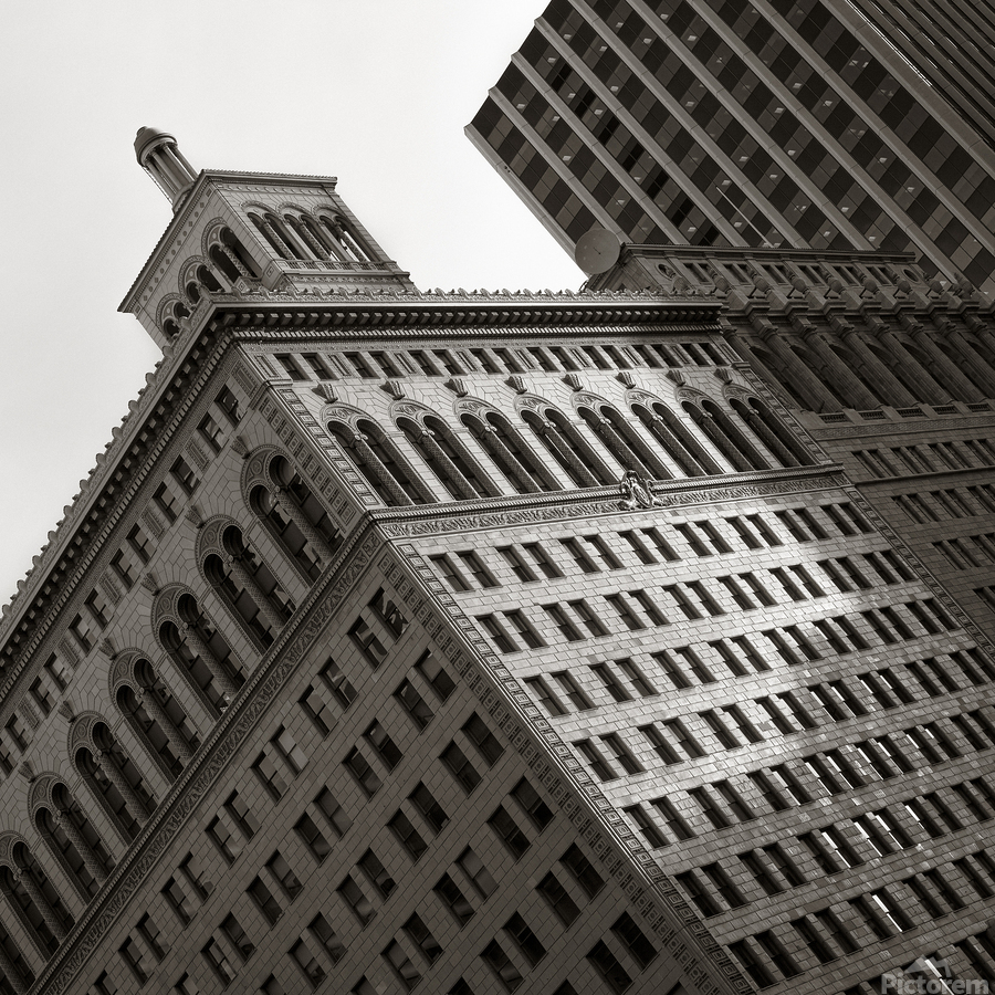 A monochrome photograph of the iconic Matson Building captured in late afternoon sunlight. The image highlights a section of the buildings facade show...[+]