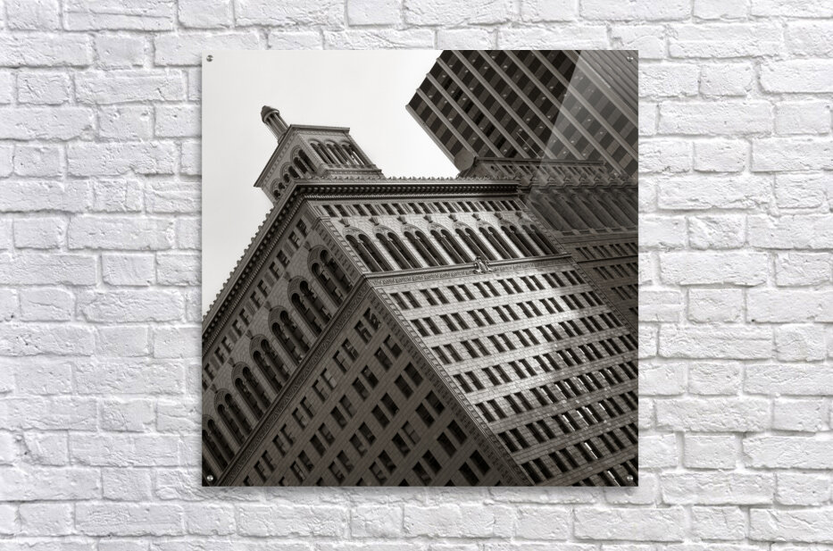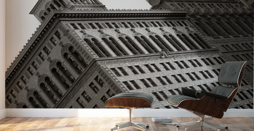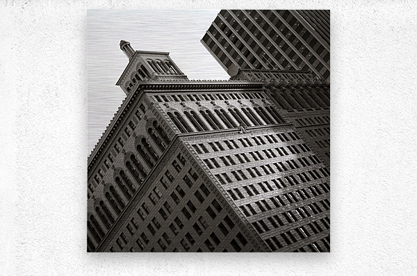 A monochrome photograph of the iconic Matson Building captured in late afternoon sunlight. The image highlights a section of the buildings facade showcasing intricate architectural details and contrasting shadows. The play of light and shadow emphasizes the structures design and texture providing a dramatic view of this historic landmark. Ideal for architectural enthusiasts historical building collections and modern decor.