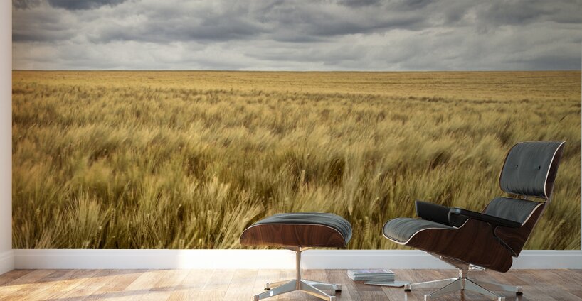 A dramatic photograph of storm clouds rolling over a barley field in Scotland capturing the contrast between the dark brooding sky and the golden hues of the ripened barley. This image highlights the rugged beauty of the Scottish landscape with an emphasis on the dynamic interplay between light and shadow. Ideal for enhancing home interiors with a touch of natural drama and scenic charm.