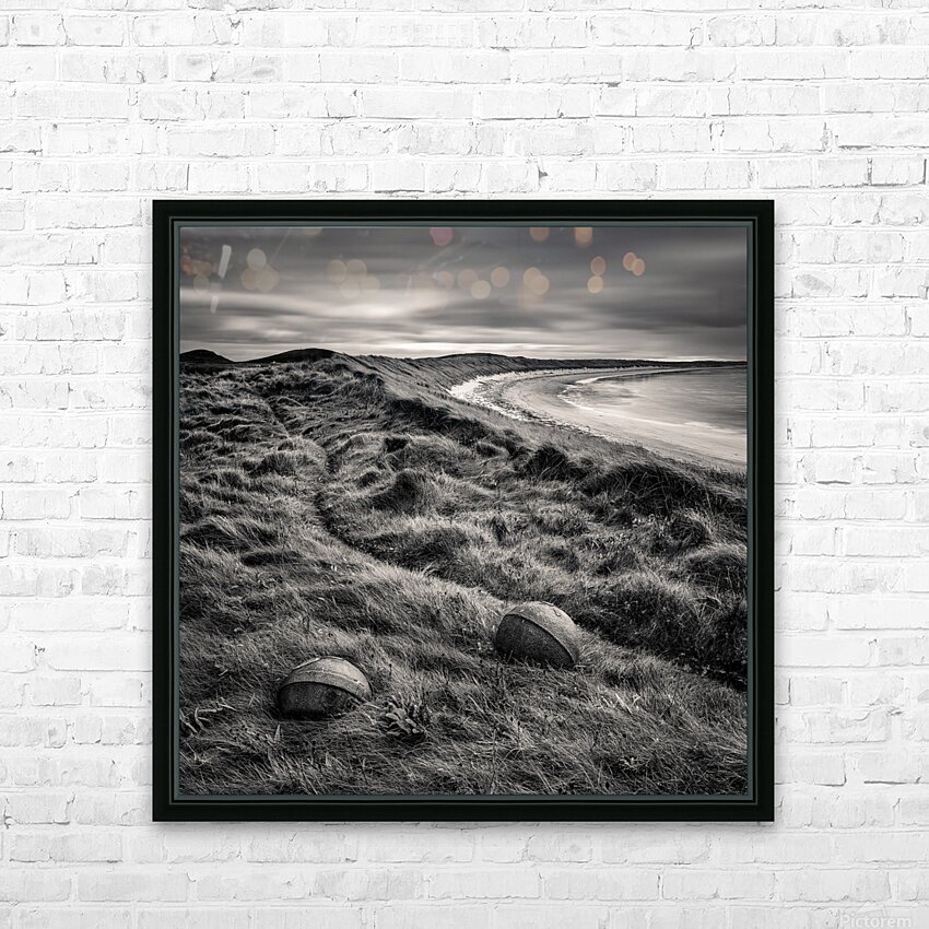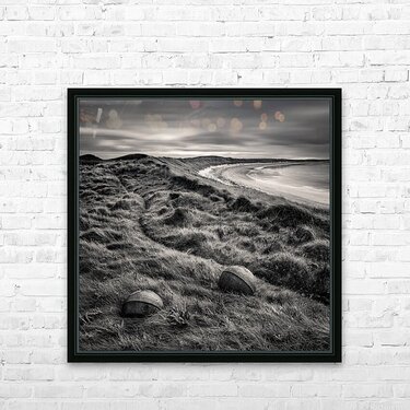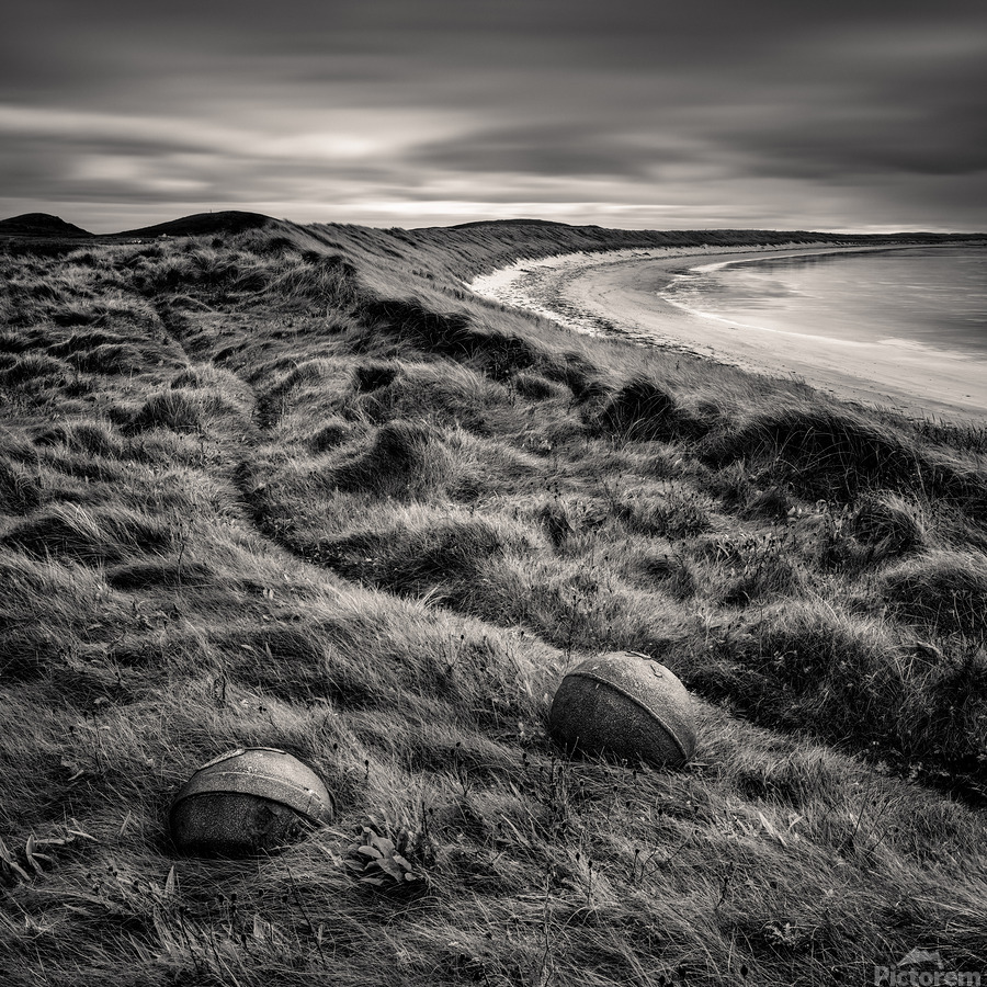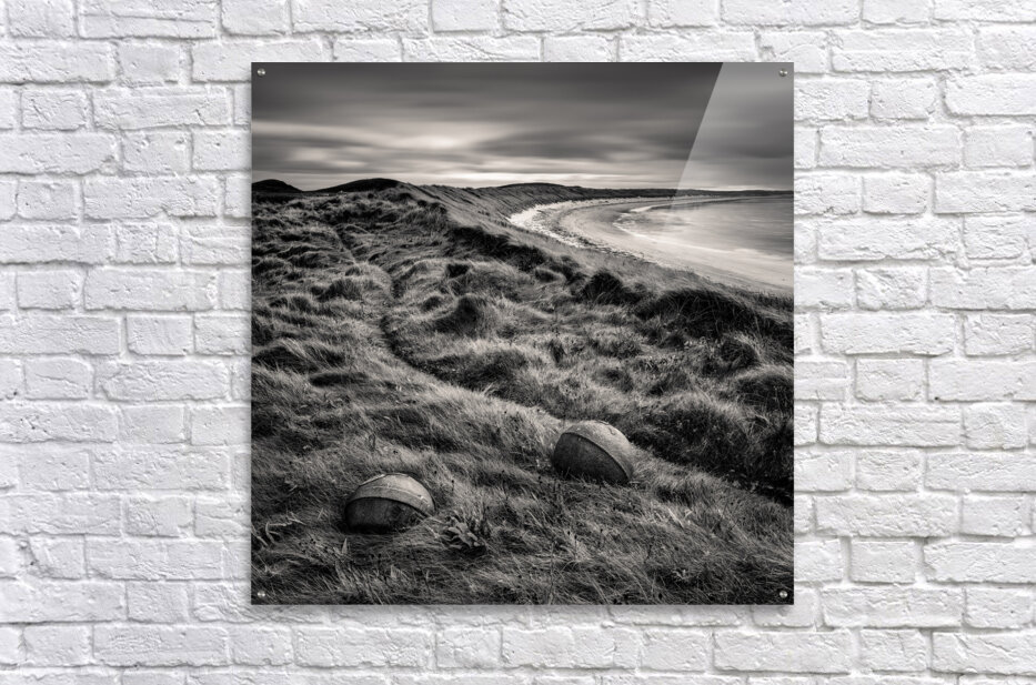 A monochrome photograph featuring two rusting sea floats nestled among the dune grass at Cula Bay Isle of Benbecula Outer Hebrides Scotland. The image captures the weathered textures and intricate details of the floats juxtaposed against the natural landscape showcasing the rugged beauty of the Scottish coastline. Ideal for coastal and landscape photography enthusiasts looking to add a touch of the Outer Hebrides unique charm to their collection.