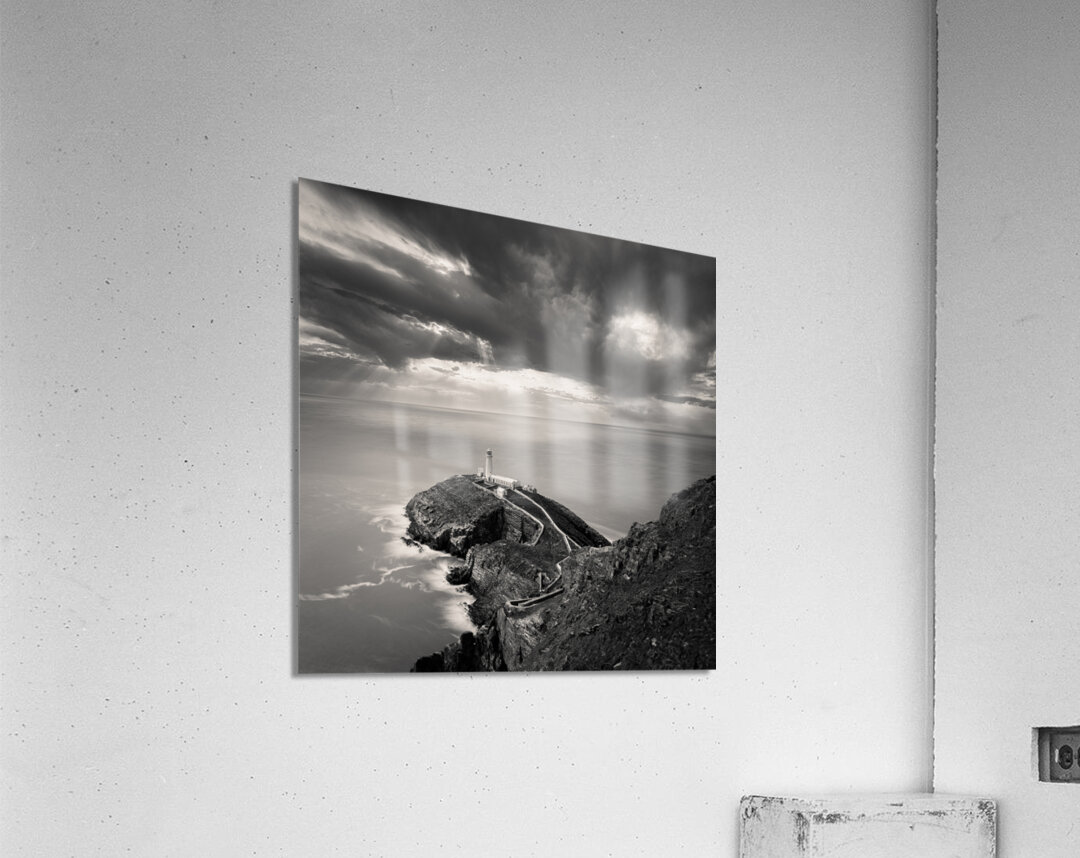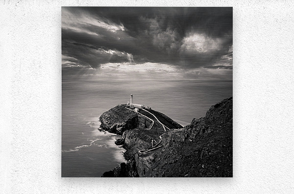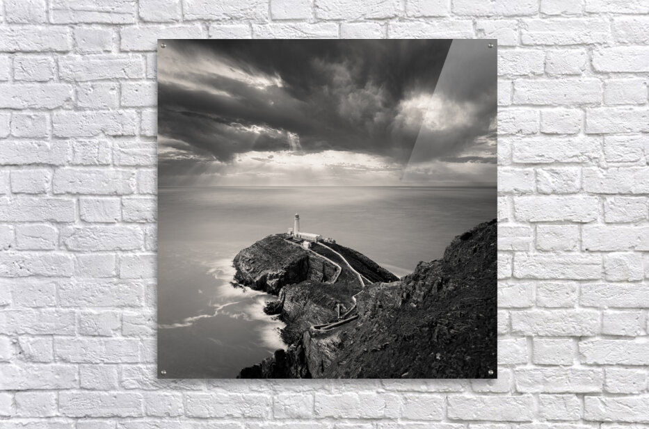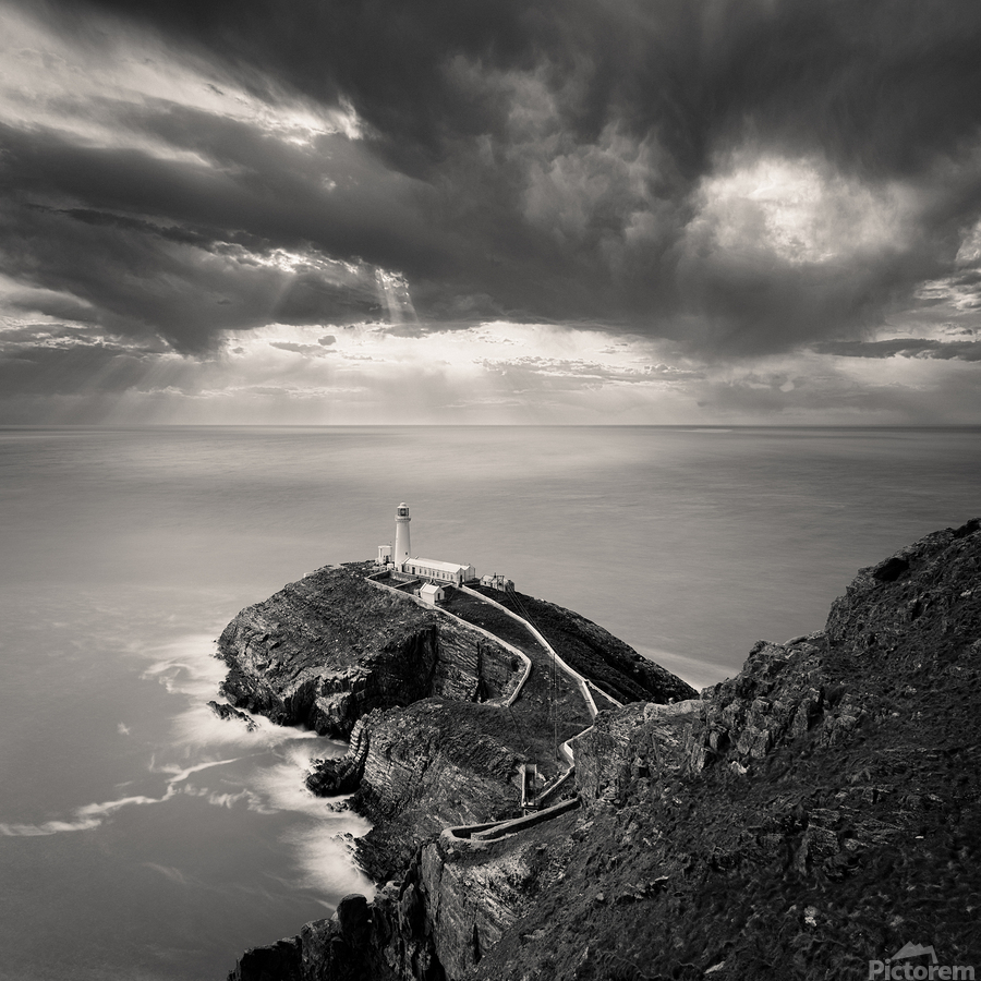 A monochrome long exposure photograph capturing a dramatic view of South Stack Lighthouse on the Isle of Anglesey North Wales. This image features the...[+]