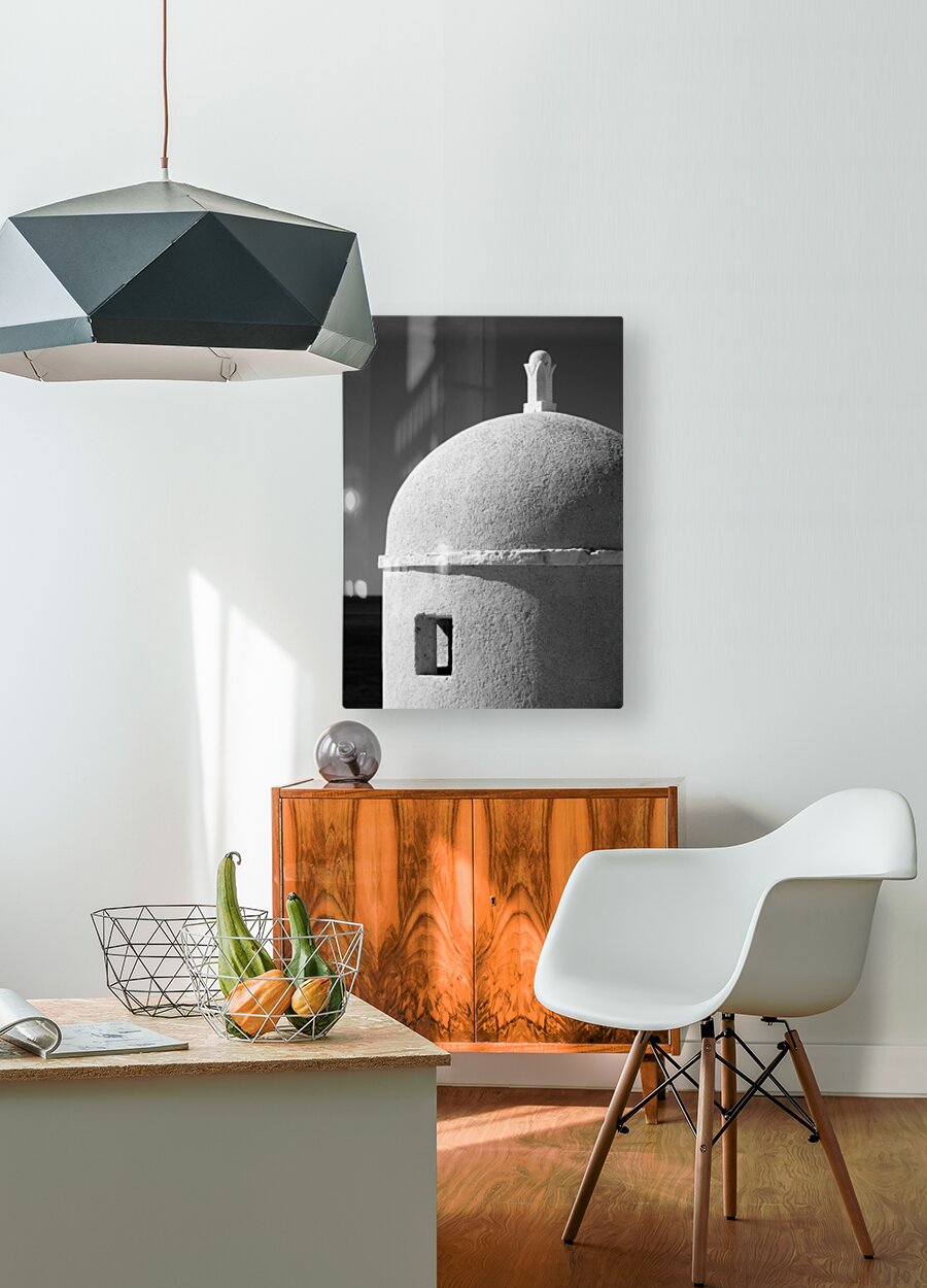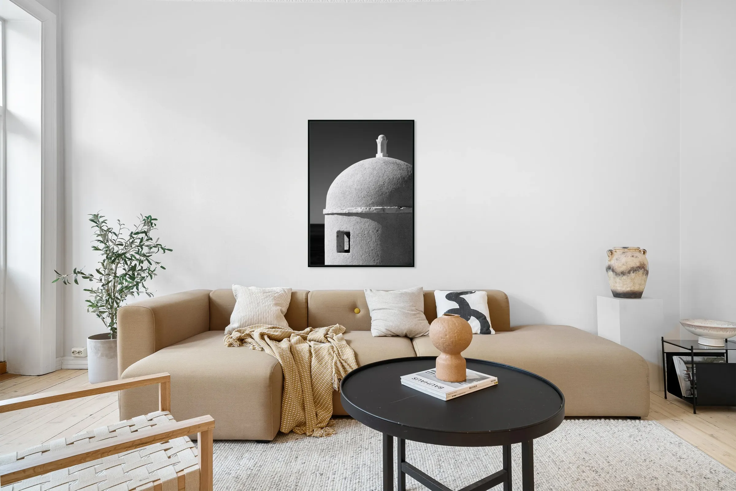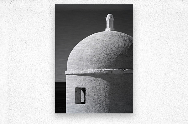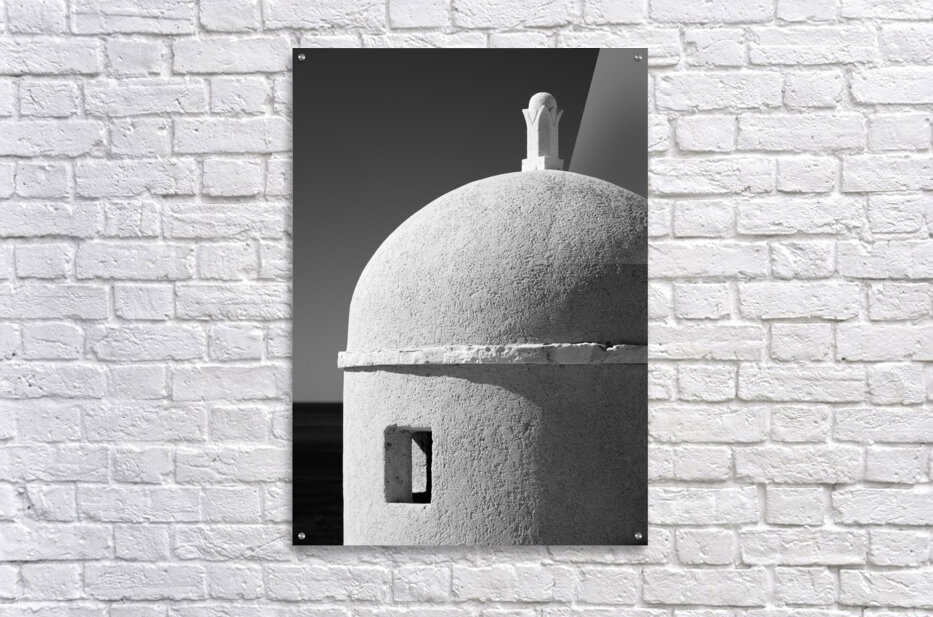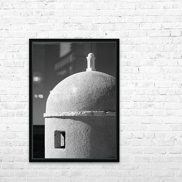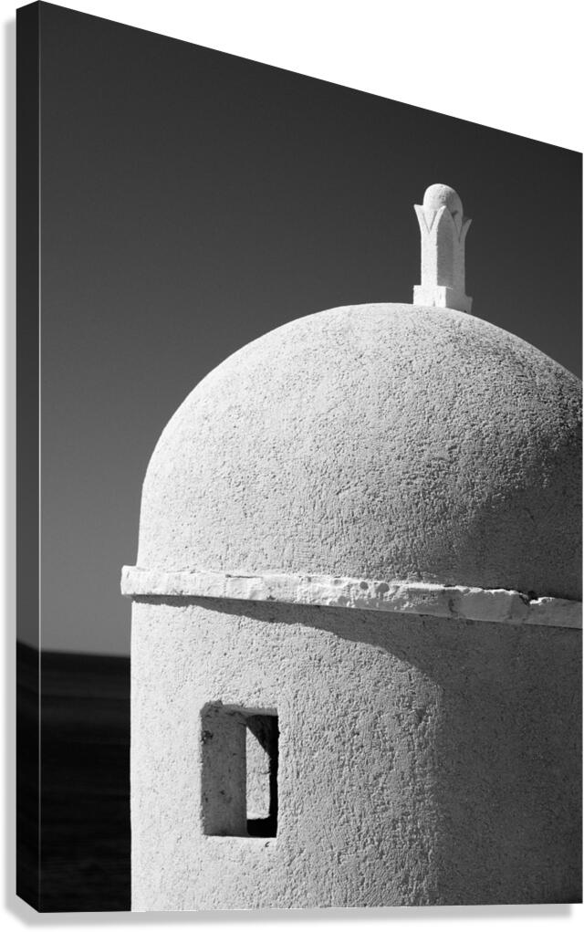 A monochrome photograph showcasing a white domed turret on the city walls of Dubrovnik Old Town Croatia. The image captures the turret bathed in sunlight with the sea visible in the background. This minimalist photograph emphasizes the architectural details of the turret against a clear sky highlighting the contrast between the structure and its surroundings. Ideal for adding a touch of historical elegance and architectural beauty to any collection.