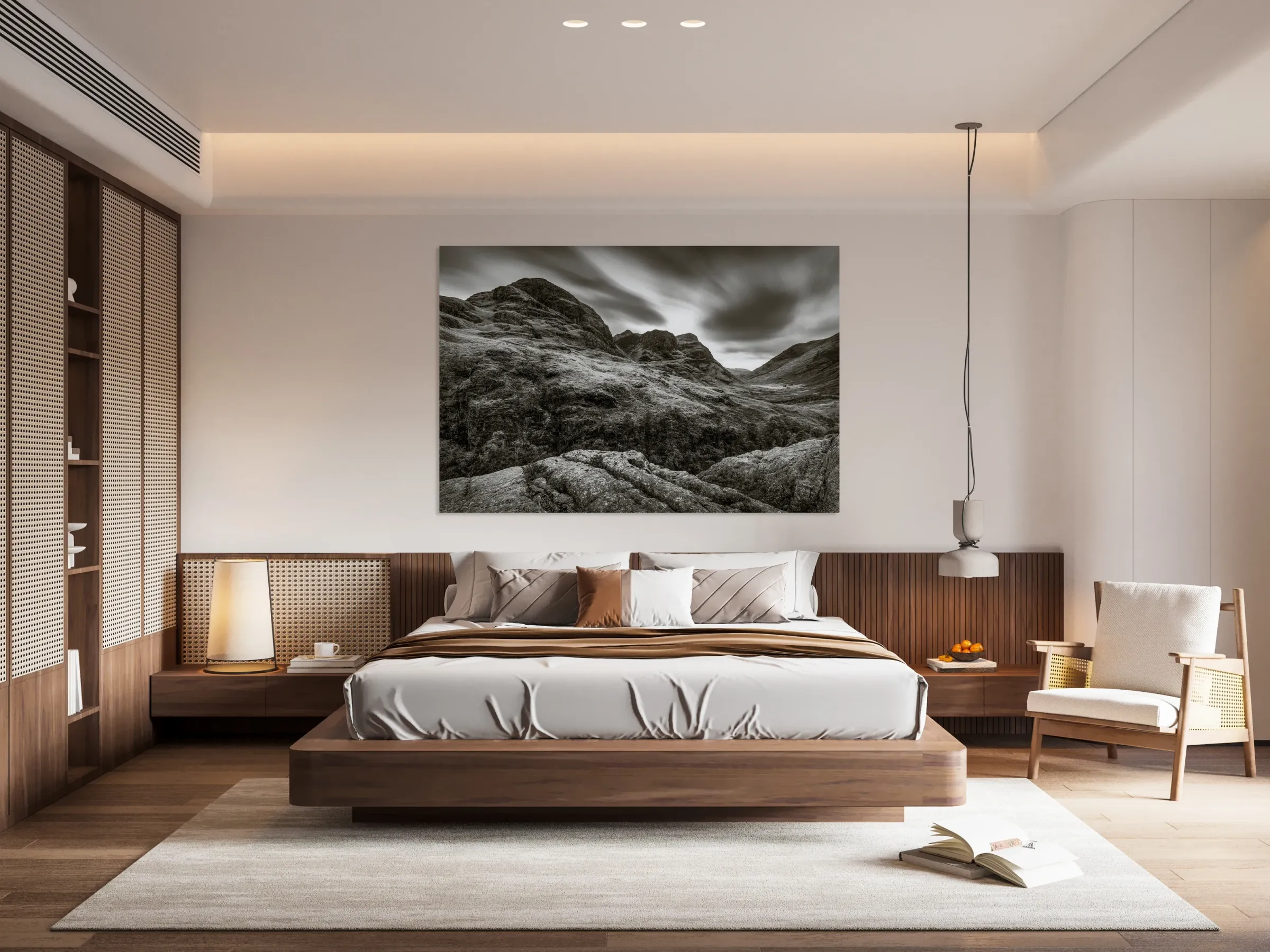 A monochrome long exposure photograph capturing The Three Sisters mountain range in Glencoe Scotland with dynamic cloud movement overhead. This striki...[+]