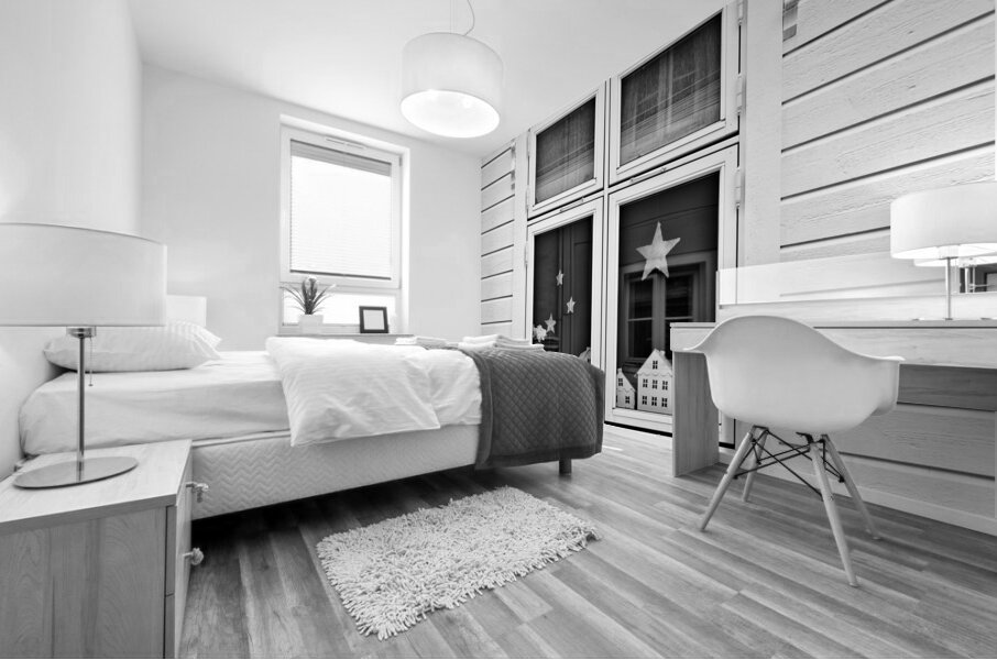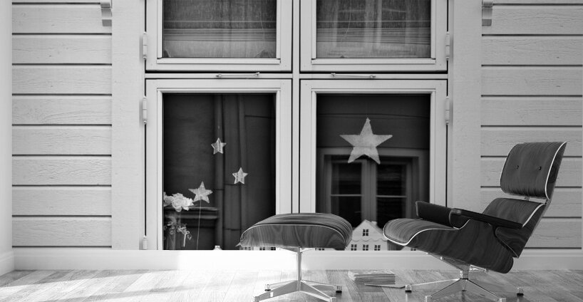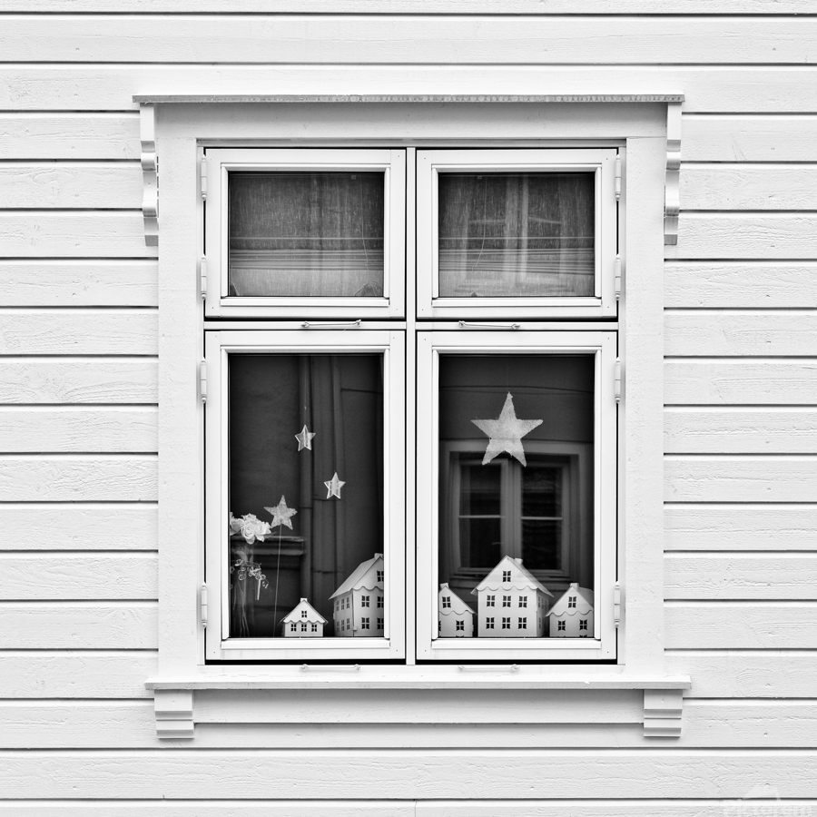 A monochrome photograph capturing model houses displayed in the window of a traditional Norwegian home in Bergen Norway. This image explores the concept of houses within a house highlighting the architectural similarities between the miniature models and the actual building. The photograph provides a striking visual contrast and perspective on domestic structures blending the intricacies of scale models with real-life architecture. A great photograph for enthusiasts of architectural details and those interested in unique perspectives on home design.
