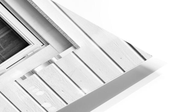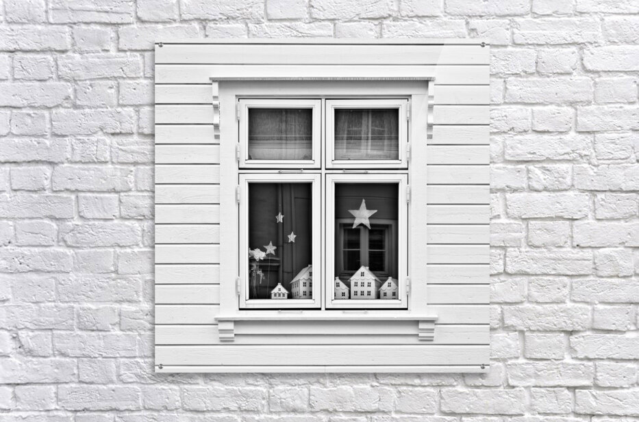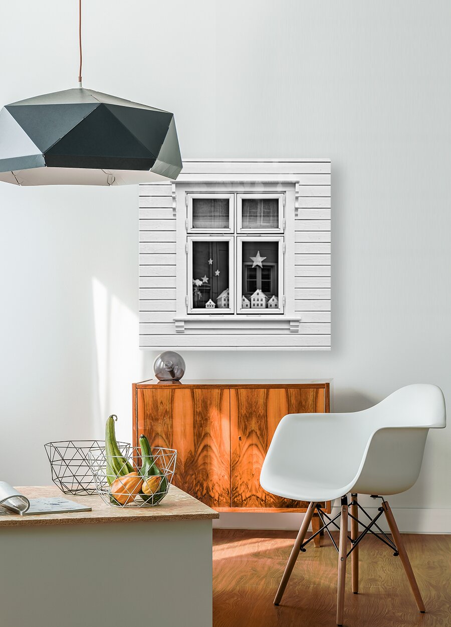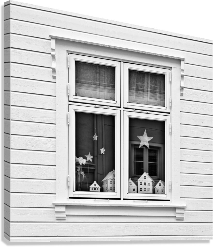 A monochrome photograph capturing model houses displayed in the window of a traditional Norwegian home in Bergen Norway. This image explores the concept of houses within a house highlighting the architectural similarities between the miniature models and the actual building. The photograph provides a striking visual contrast and perspective on domestic structures blending the intricacies of scale models with real-life architecture. A great photograph for enthusiasts of architectural details and those interested in unique perspectives on home design.