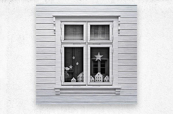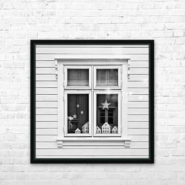 A monochrome photograph capturing model houses displayed in the window of a traditional Norwegian home in Bergen Norway. This image explores the conce...[+]