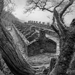 A monochrome photograph capturing Anglesey Barracks nestled between the gnarled branches of two ancient trees in North Wales. This evocative image portrays the once-bustling hub for slate quarry workers with its stone walls now silent reflecting the hard labor and camaraderie of a bygone era. The contrast of the aged architecture against the twisted tree branches emphasizes the barracks historical significance and solemn atmosphere. Ideal for historical enthusiasts and those interested in capturing the essence of North Wales industrial past.
