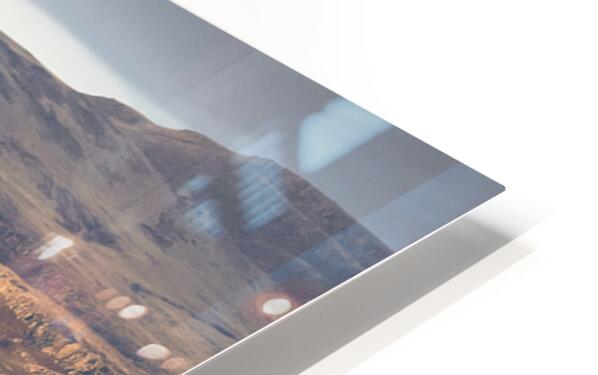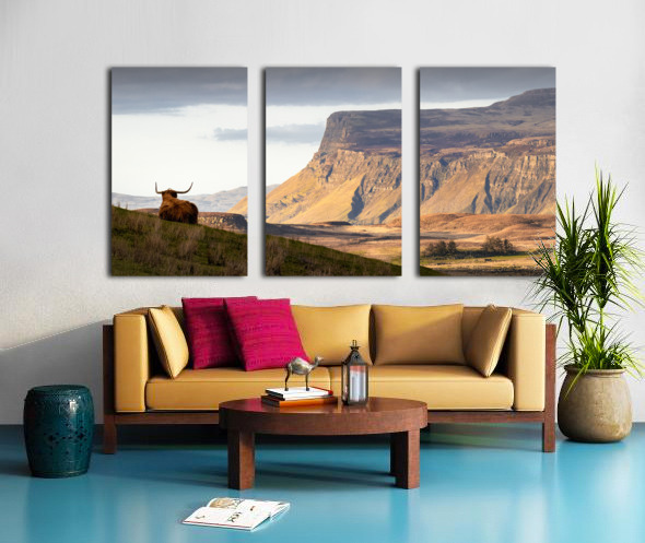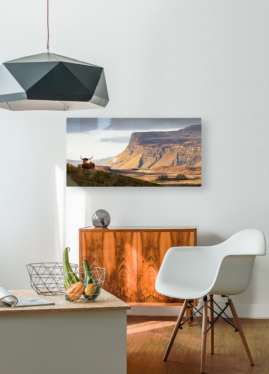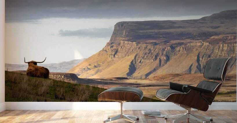 A panoramic view of a Highland cow Coo overlooking the Isle of Mull at sunset Inner Hebrides Scotland. The cow with its back to the camera gazes across the expansive landscape as the distant mountains are illuminated by the warm hues of evening light. The scene captures the tranquil beauty of the Scottish Highlands and the serene charm of the Inner Hebrides. A perfect photograph for those seeking to bring the majestic landscape and unique wildlife of Scotland into their home or office.