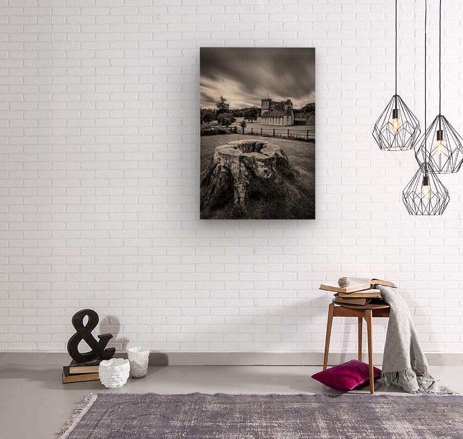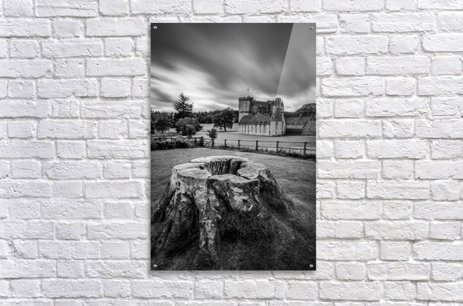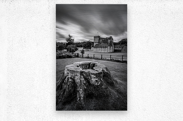 A monochrome long exposure photograph of Castle Fraser in Aberdeenshire Scotland captured on an overcast day. The image features an old tree stump in the foreground with the historic castle prominently displayed in the background. This detailed black and white photograph highlights the timeless architecture of Castle Fraser amidst a dramatic and moody landscape. The ideal photograph for enthusiasts of historical architecture landscape photography and Scottish heritage.