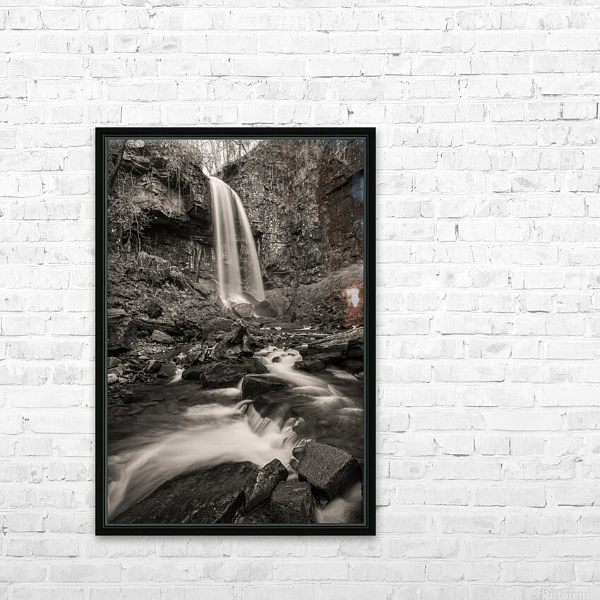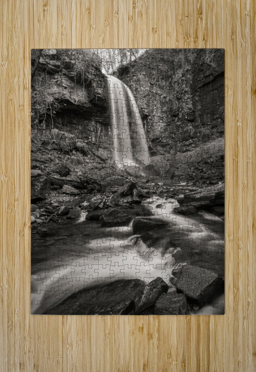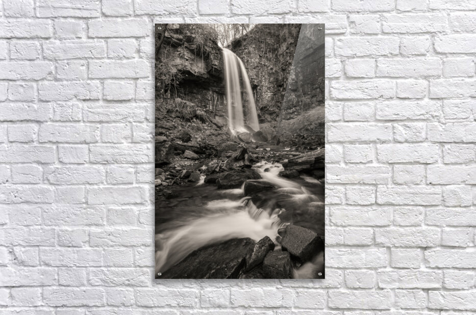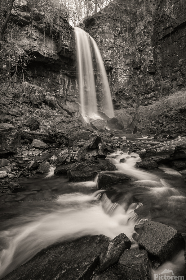A monochrome long exposure photograph capturing the majestic Melincourt Waterfall as it cascades 80 feet over rugged rocks into Melin Court Brook. Thi...[+]