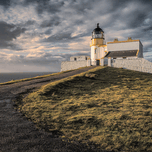 A photograph of Stoer Head Lighthouse at sunset located in Sutherland Scotland. The image captures the road leading up to the lighthouse with soft hue...[+]