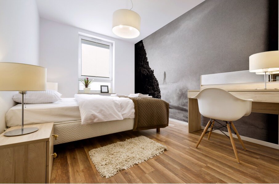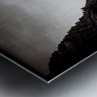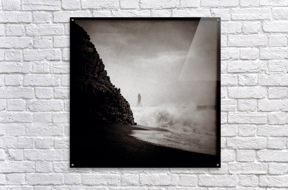 A monochrome photograph of Reynisdrangar a striking basalt sea stack located off the coast of Vik Iceland. Captured amidst the power of a raging sea the photograph showcases the raw and dramatic landscape of Icelands southern coast. The towering basalt formations sculpted by natural forces rise sharply from the turbulent waters creating a powerful contrast in black and white. The moody tones of the image highlight the intensity of the North Atlantic Ocean against the rugged coastline. A great photograph for those interested in Icelandic landscapes natural wonders or coastal photography.