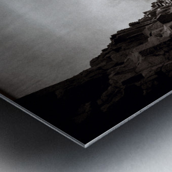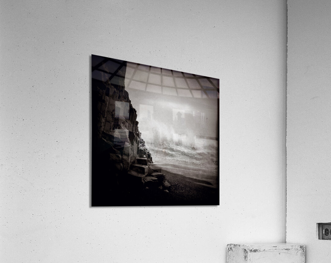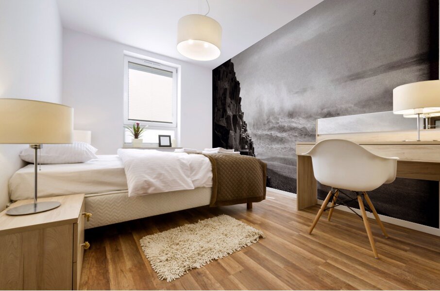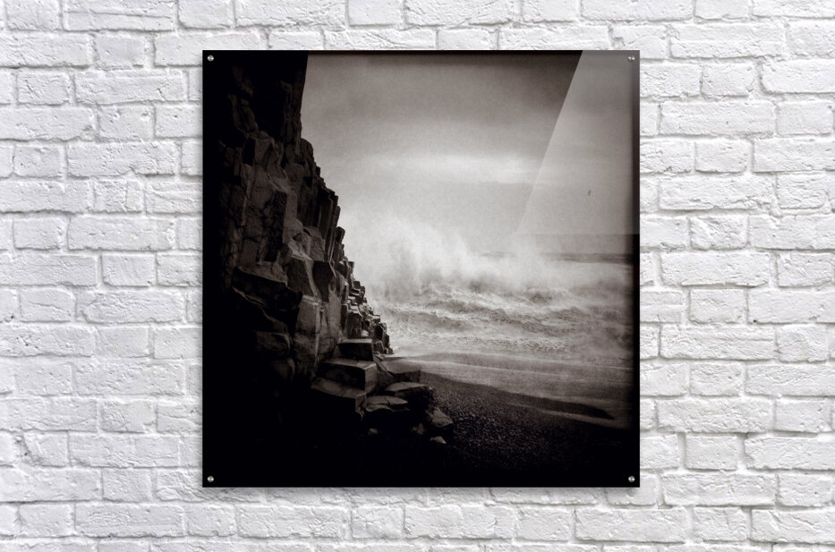 A monochrome photograph capturing the dramatic basalt rock formations on Vik beach Iceland set against the backdrop of a turbulent raging sea. The stark contrasts of black and white emphasize the unique geometric patterns of the basalt columns while the powerful waves crashing onto the shore add a sense of raw untamed nature. The ideal photograph for those seeking to bring the rugged beauty of Icelandic landscapes into their space particularly suited for enthusiasts of coastal geology or those drawn to the power of natural forces.