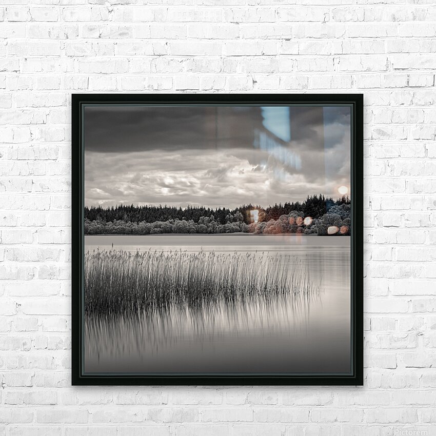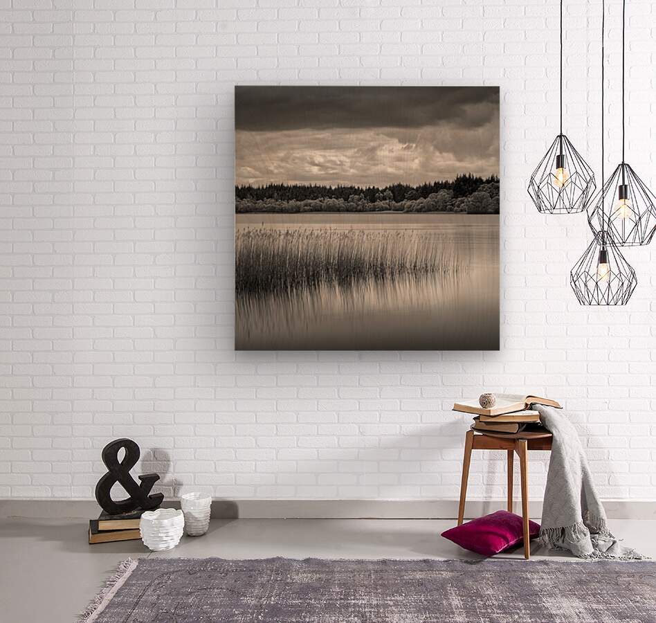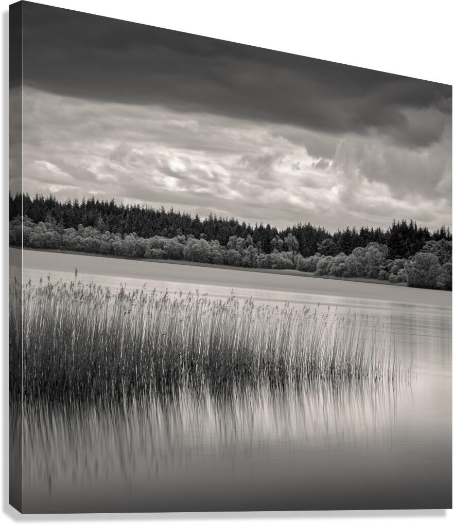 A monochrome photograph of the Lake of Menteith in Scotland capturing the serene reflection of reeds in the still water. The composition features the distant shoreline lined with trees creating a striking contrast against a sky filled with a mix of light and dark clouds. A great photograph for those who appreciate tranquil Scottish landscapes and detailed natural scenes.