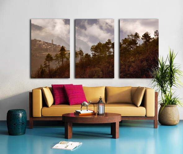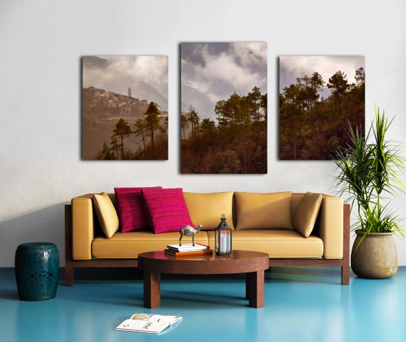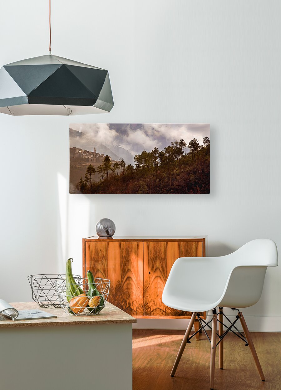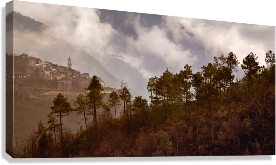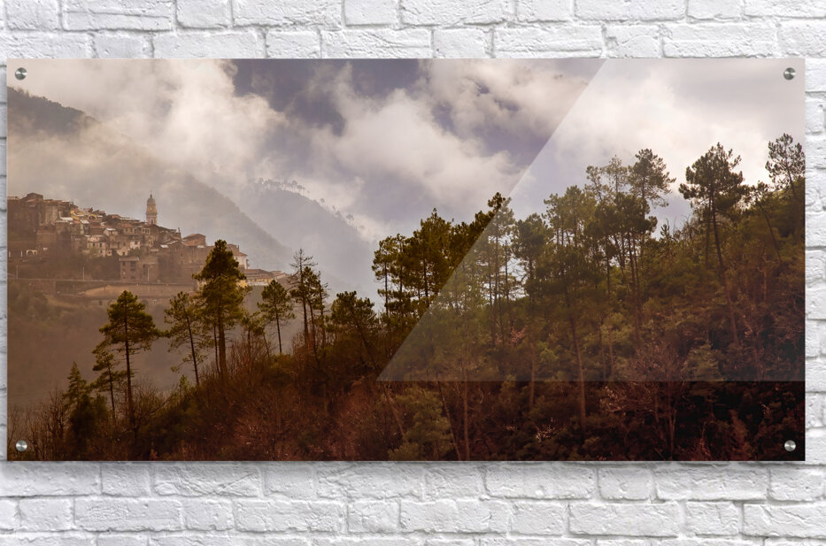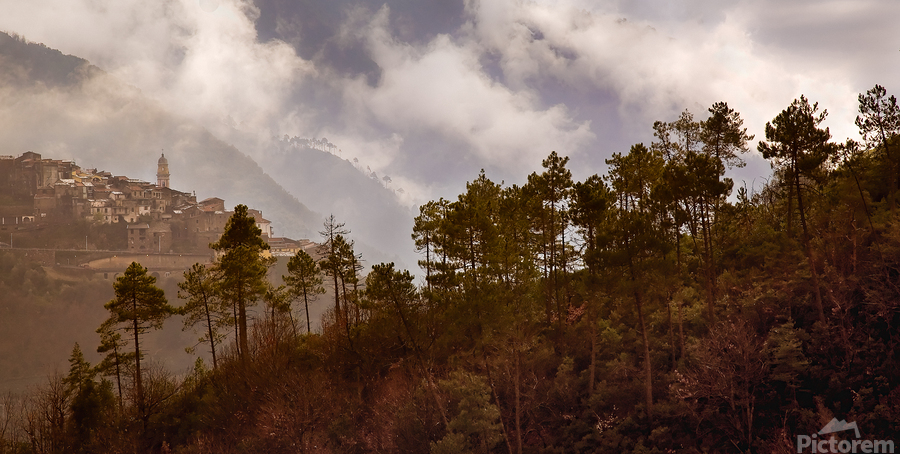 A panoramic photograph capturing the picturesque Italian village of Triora nestled high in the Ligurian mountains and enveloped in clouds. The scene features silhouetted trees on a foreground mountain enhancing the depth and tranquility of the landscape. This image showcases the charming and remote character of Triora set against the dramatic mountainous backdrop. A perfect photograph for those seeking to add a touch of serene Italian countryside to their collection.