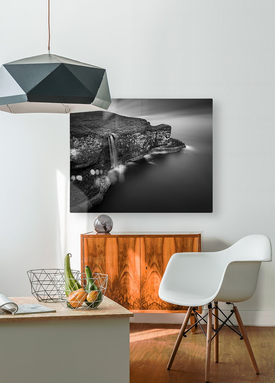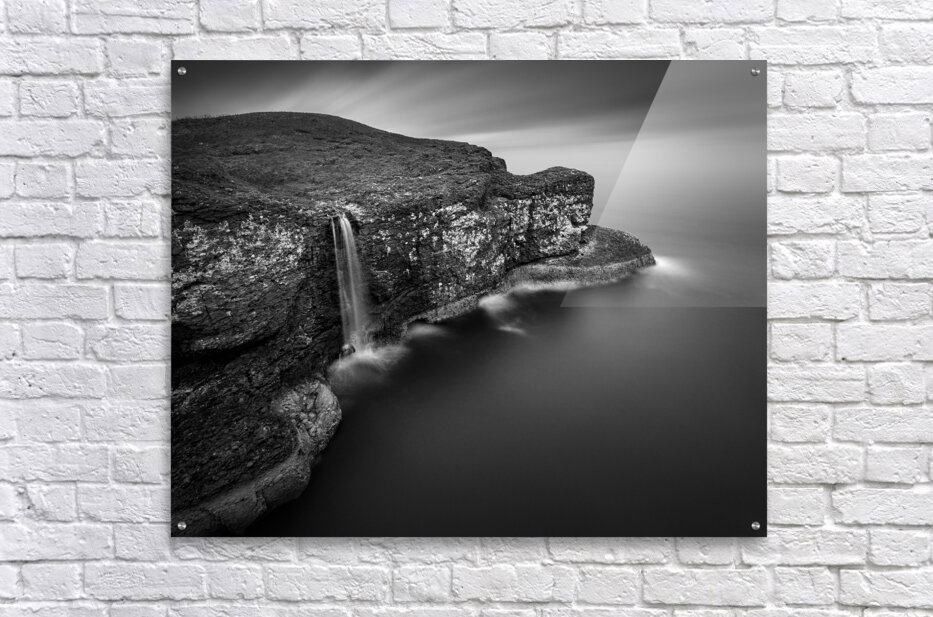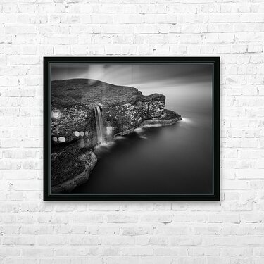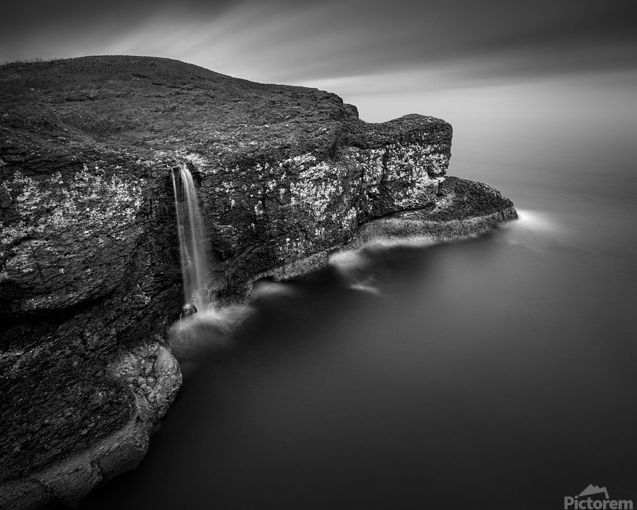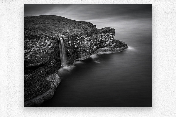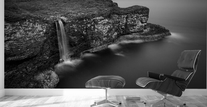 A waterfall cascades over the rugged cliffs at Crawton in Aberdeenshire, Scotland, with the flowing water contrasting against the jagged texture of the rock face. This scene captures the dramatic beauty of the Scottish coastline in its raw, natural form. A great photograph for those who appreciate the power and simplicity of nature's landscapes and the unique character of Scotland’s coastal scenery.