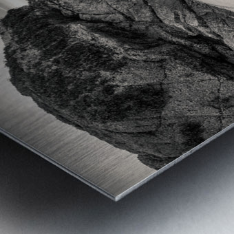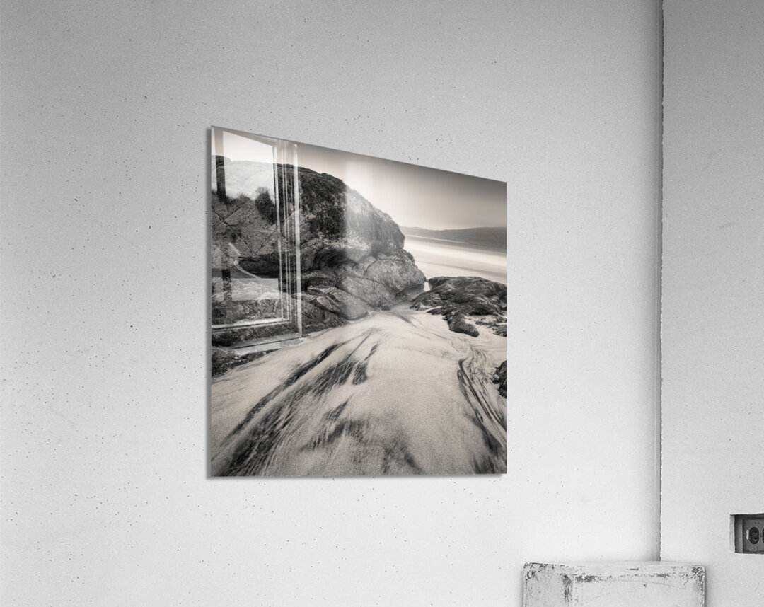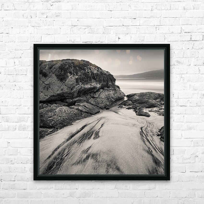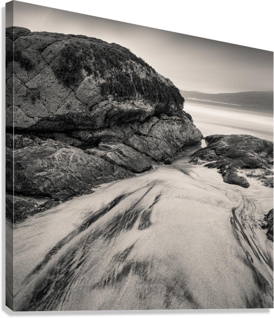A monochrome long exposure photograph of Traigh Niosaboist beach on the Isle of Harris Outer Hebrides Scotland with rocks prominently featured in the foreground. The extended exposure captures the tranquil movement of the sea creating a soft blurred effect that contrasts with the texture of the rocks. The black and white composition highlights the natural beauty and peaceful atmosphere of this remote coastal landscape. A perfect photograph for those looking to bring a sense of calm and nature into their space especially lovers of coastal and monochrome photography.