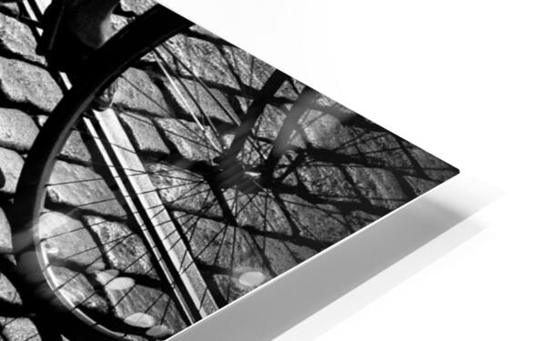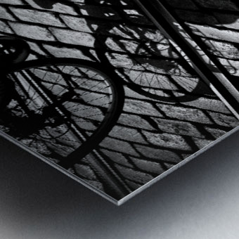 A monochrome photograph capturing a cyclist maneuvering through the cobbled streets of Gent, Belgium. The image focuses on the shadow of the bike and ...[+]