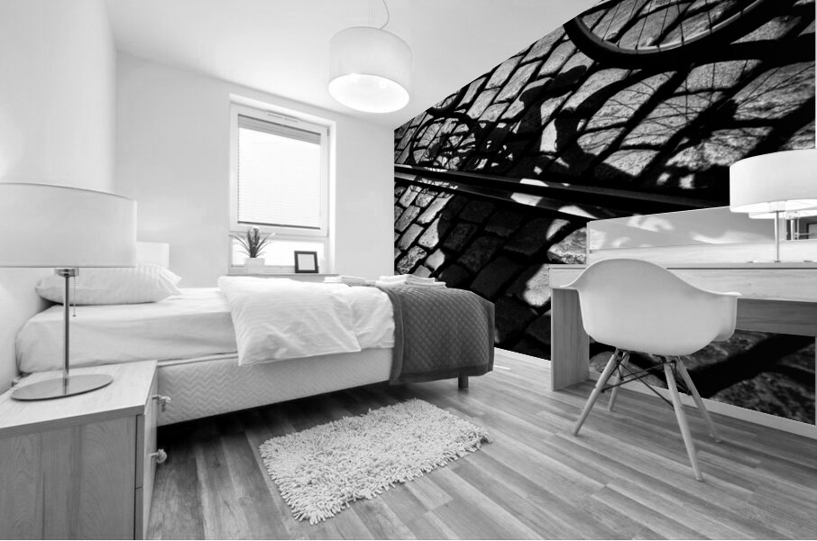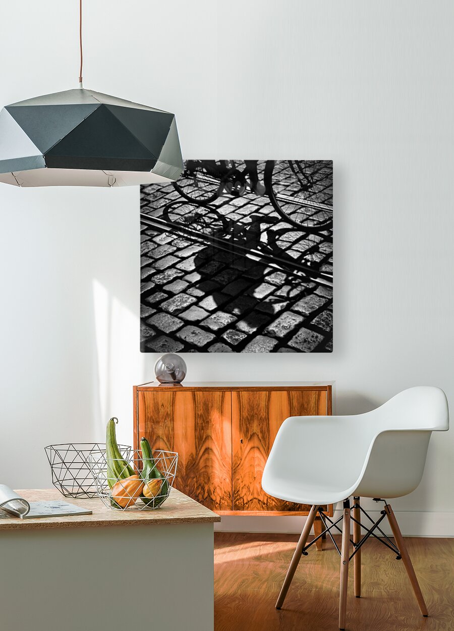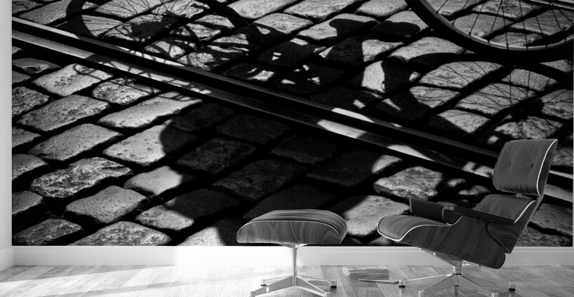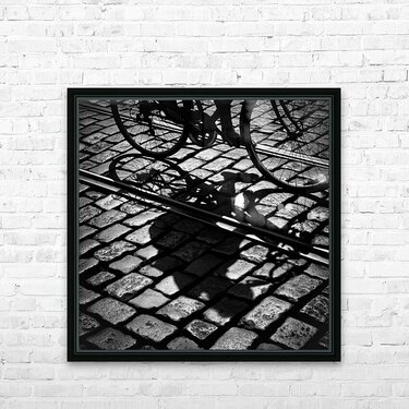 A monochrome photograph capturing a cyclist maneuvering through the cobbled streets of Gent, Belgium. The image focuses on the shadow of the bike and rider as they glide between two tramlines, highlighting the texture of the historic cobblestones. The low angle and framing emphasize the interaction between the cyclist's movement and the city’s aged infrastructure. A great photograph for urban design enthusiasts, architecture lovers, or those seeking a unique depiction of European street life.