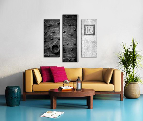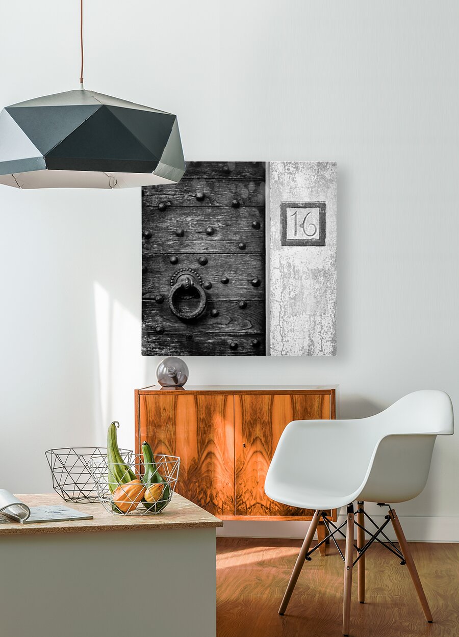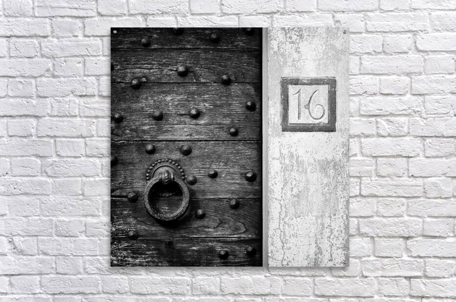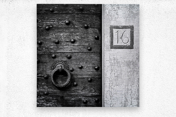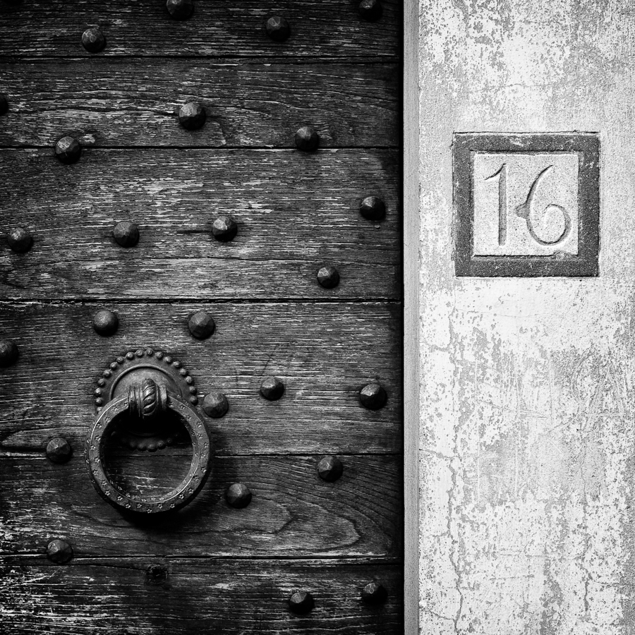 A monochrome photograph capturing the intricate details of an old, weathered wooden door in Fiesole, Italy. The door's surface shows the texture of age, with a large round door knocker as its centerpiece, offering a glimpse into the craftsmanship of a bygone era. The number 16 is clearly visible beside the door, adding an authentic touch to this piece of Italian history. A perfect photograph for those who appreciate the beauty of aged wood, architectural details, or Italian heritage.