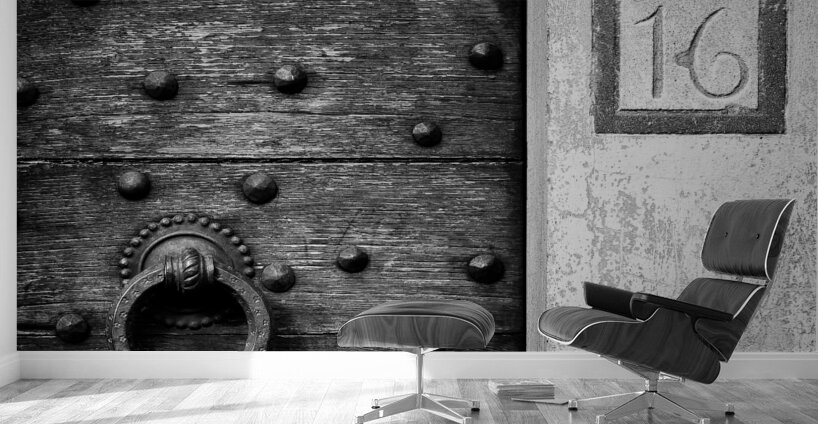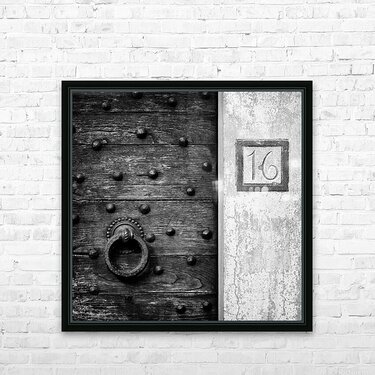 A monochrome photograph capturing the intricate details of an old, weathered wooden door in Fiesole, Italy. The door's surface shows the texture of age, with a large round door knocker as its centerpiece, offering a glimpse into the craftsmanship of a bygone era. The number 16 is clearly visible beside the door, adding an authentic touch to this piece of Italian history. A perfect photograph for those who appreciate the beauty of aged wood, architectural details, or Italian heritage.