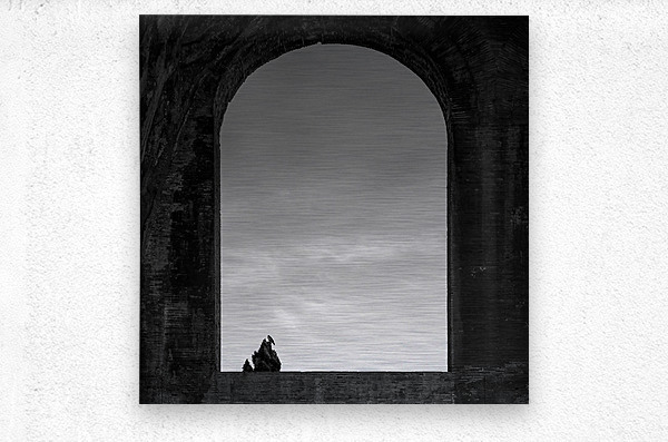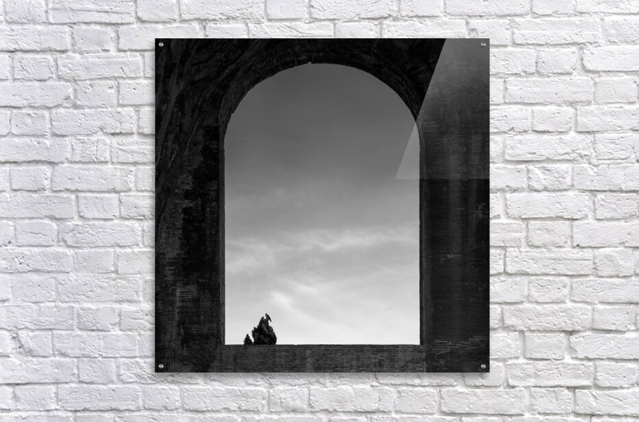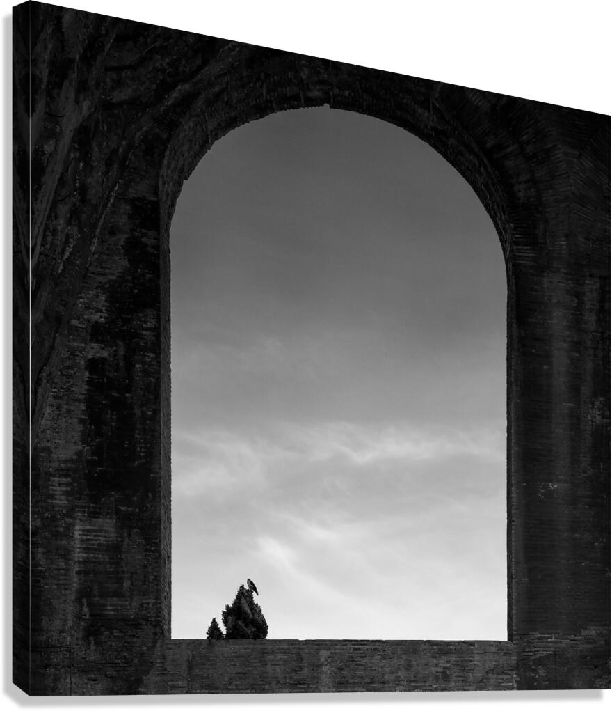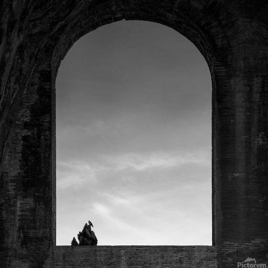 A monochrome photograph of a bird perched at the top of a tree, silhouetted against a sky with a few wispy clouds. Captured through an arched window in the Roman Forum, Rome, Italy, the minimalist composition highlights the stark contrast between the dark silhouette of the bird and tree against the light sky. The arched window frames the scene, adding a sense of historical depth to the simple and serene image. A perfect photograph for those drawn to minimalist art with a touch of historical ambiance.