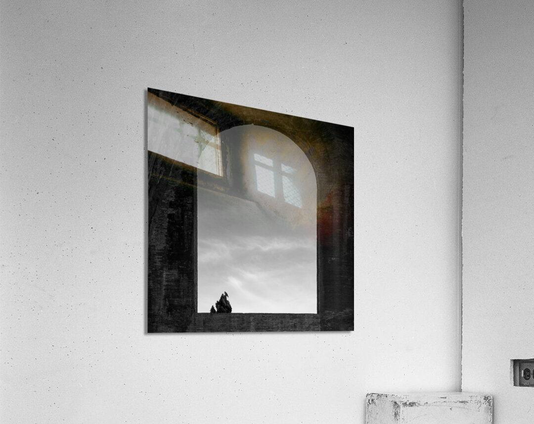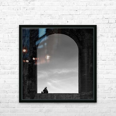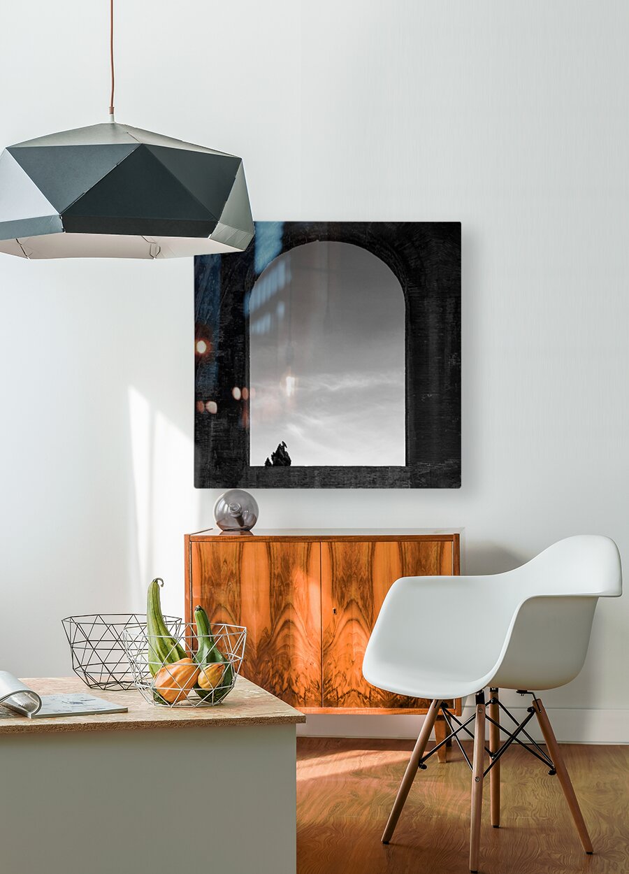 A monochrome photograph of a bird perched at the top of a tree, silhouetted against a sky with a few wispy clouds. Captured through an arched window i...[+]