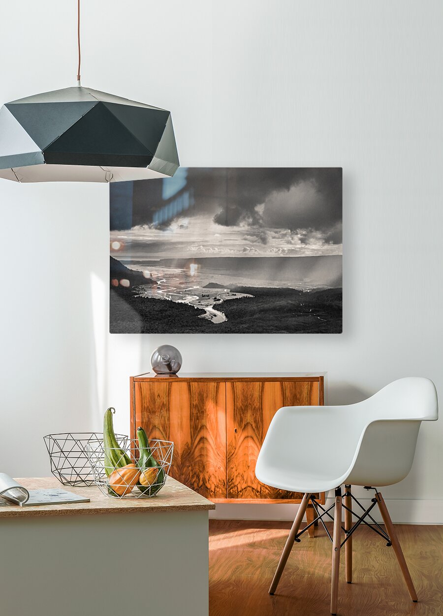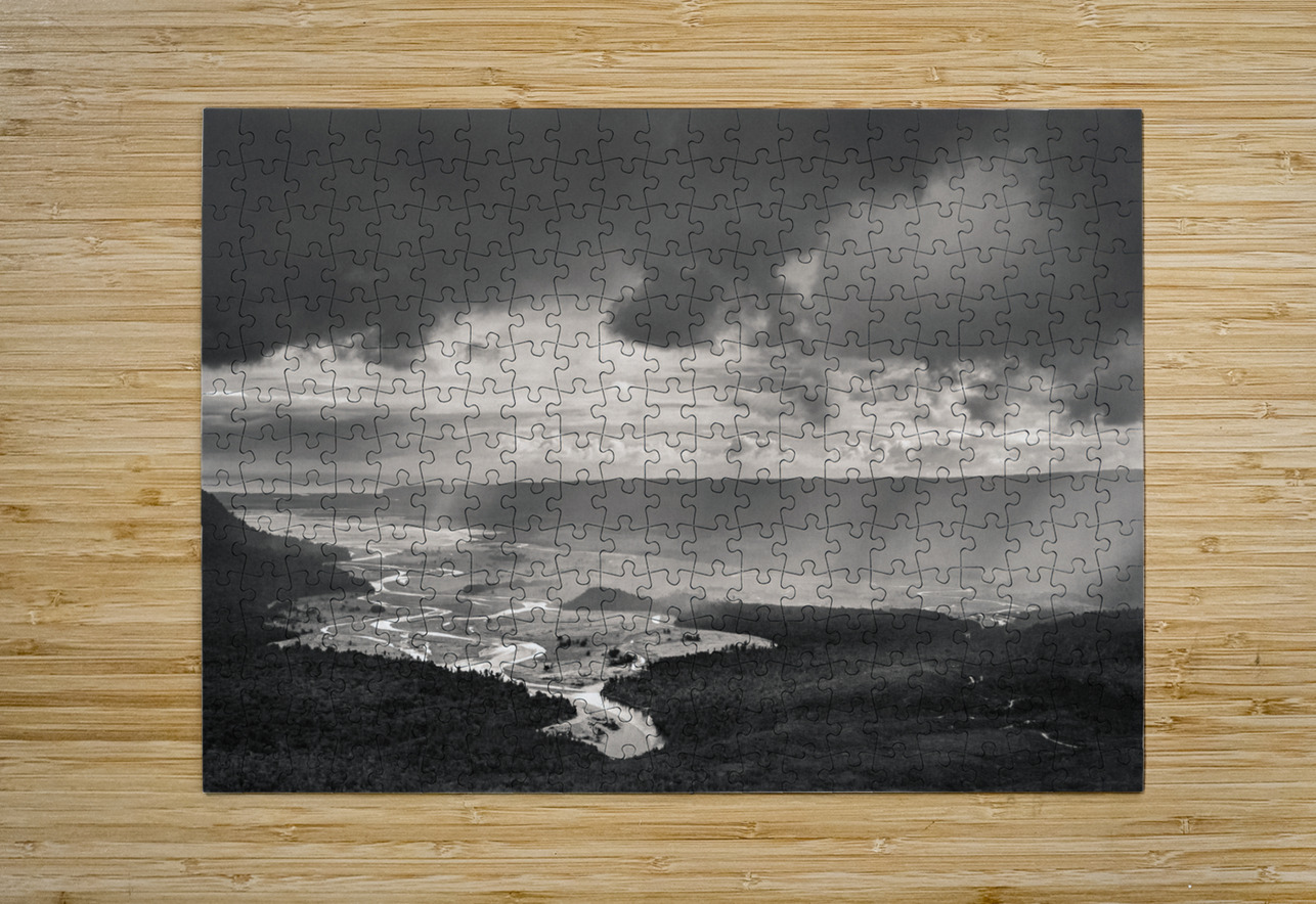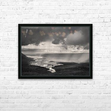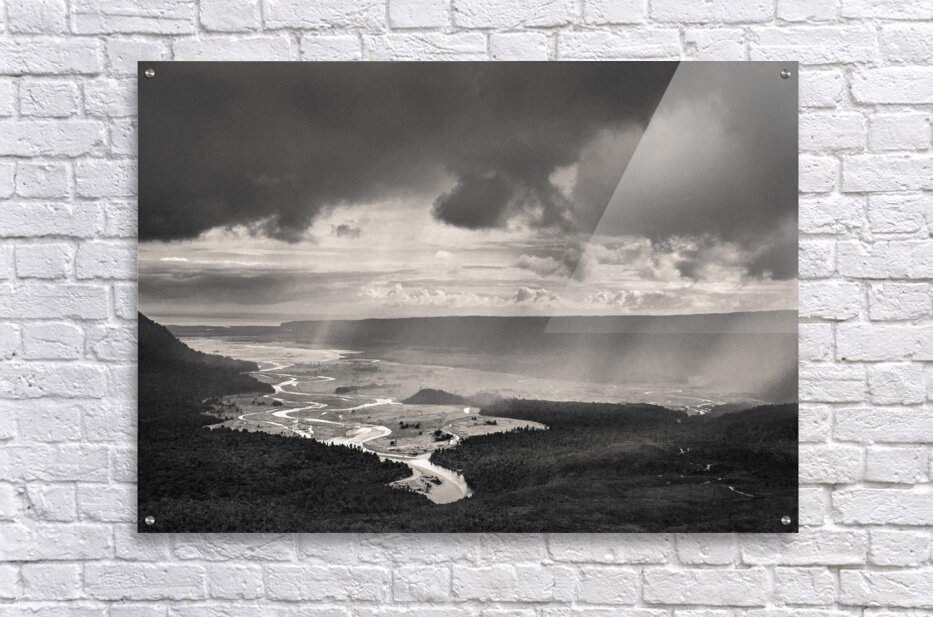 A monochrome photograph capturing the dramatic scene of heavy rain clouds rolling into a remote valley on New Zealand's South Island. The valley features a winding river that stretches into the distance, creating a sense of depth and vastness. The contrast between the dark clouds and the light reflecting off the river highlights the natural beauty and wildness of the landscape. A great photograph for nature enthusiasts, or anyone looking to bring the raw beauty of New Zealand into their space.