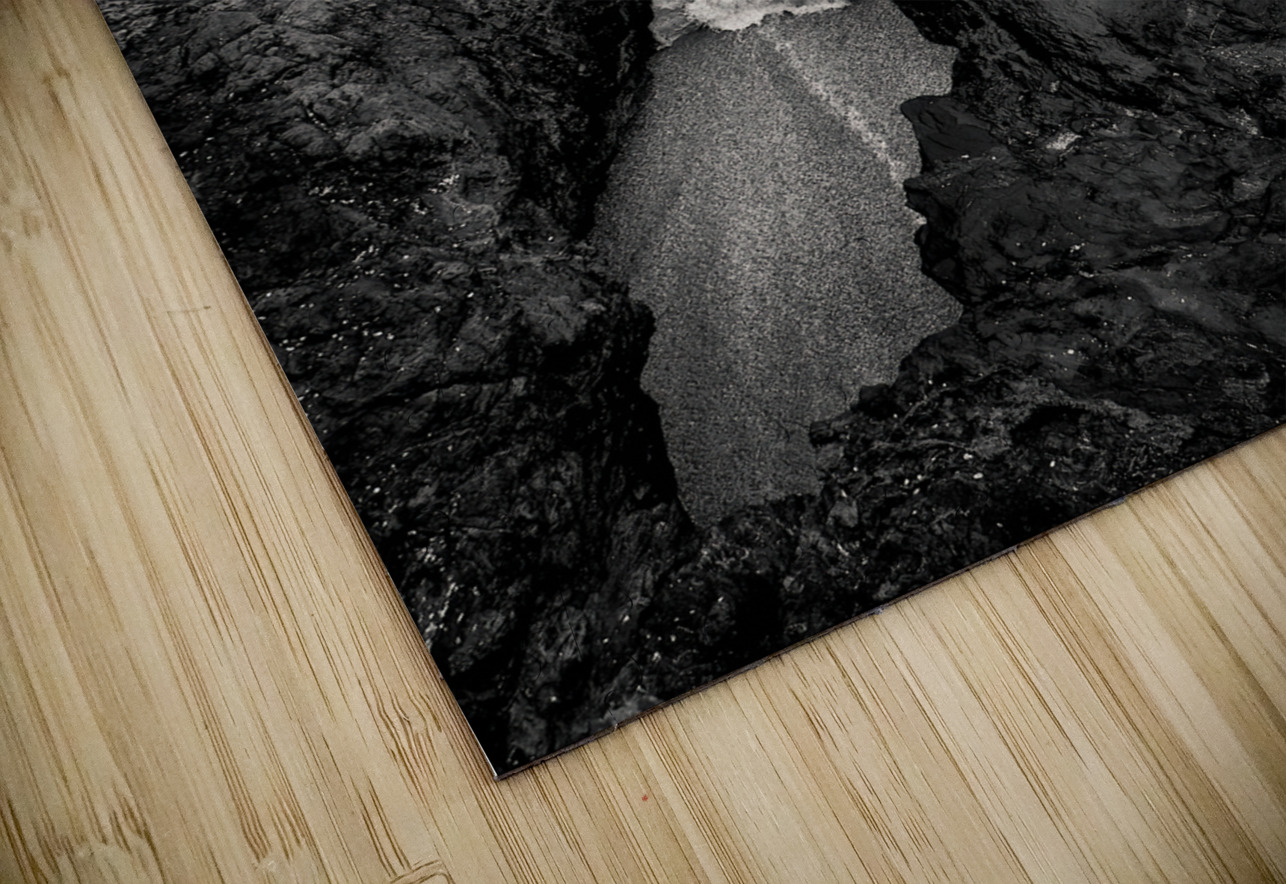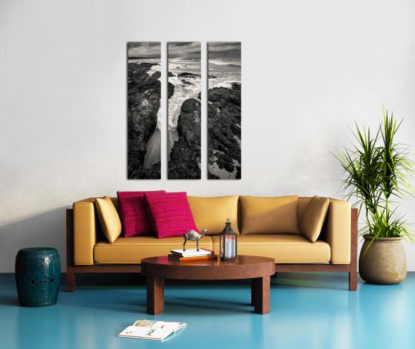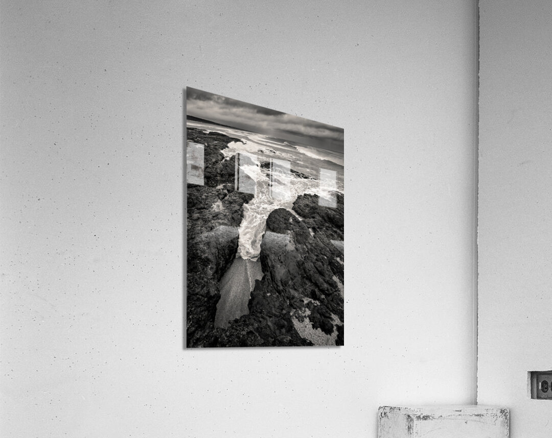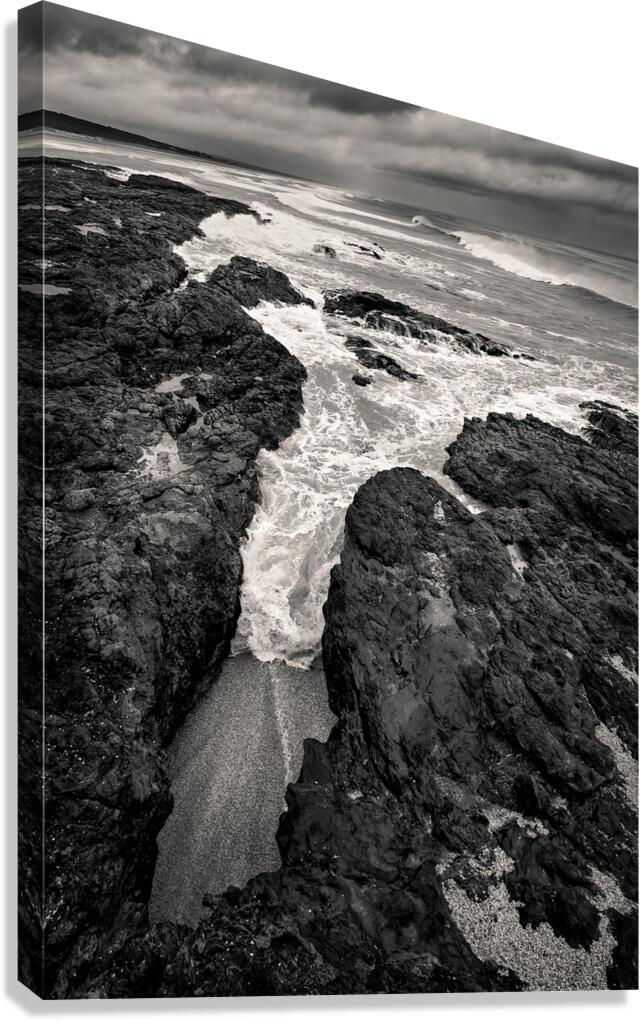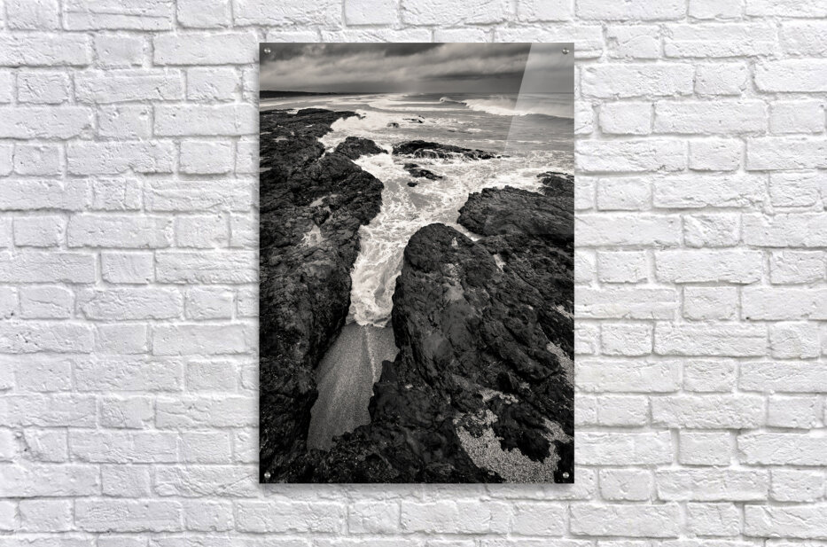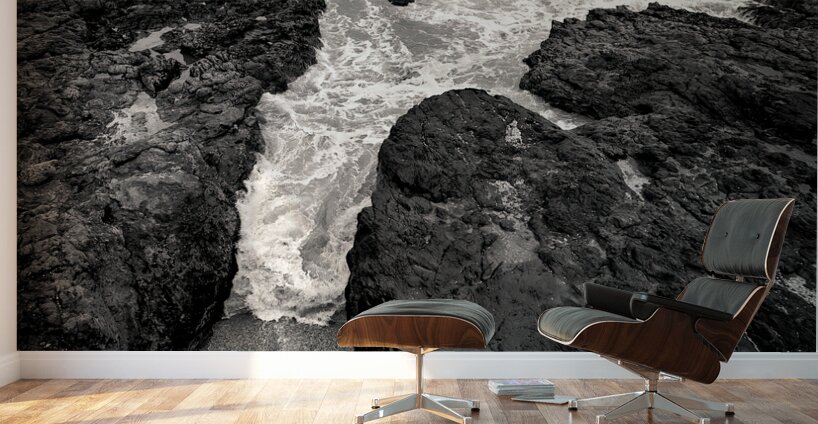 A monochrome photograph capturing powerful waves crashing against rugged rocks on Ninety Mile Beach, located on the North Island of New Zealand. The high-contrast black-and-white tones emphasize the dynamic movement of the sea and the texture of the rocky coastline. This image encapsulates the raw energy of the ocean and the untamed beauty of New Zealand's coastal landscape. A great photograph for those seeking dramatic seascapes or a striking natural element in their interior spaces.