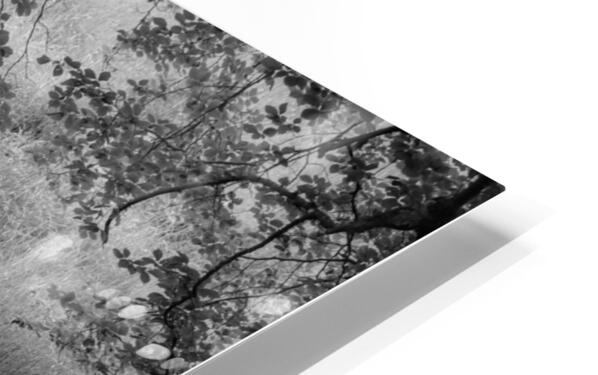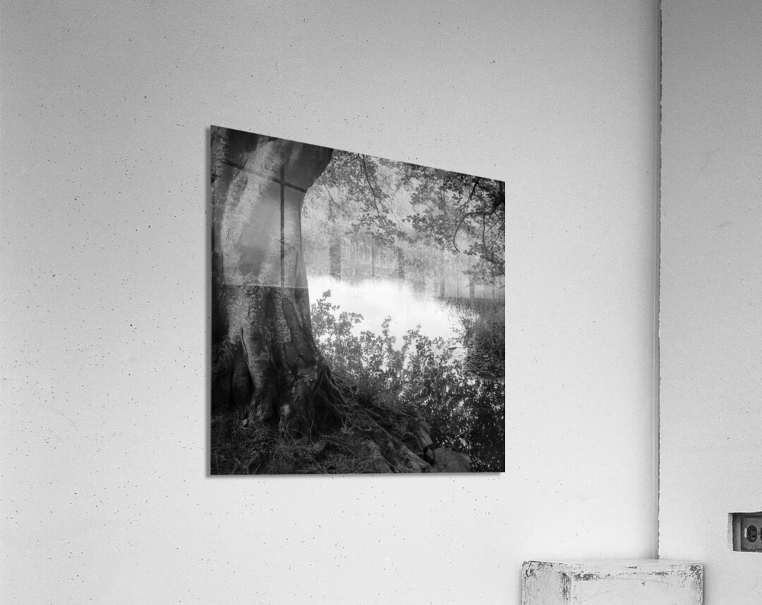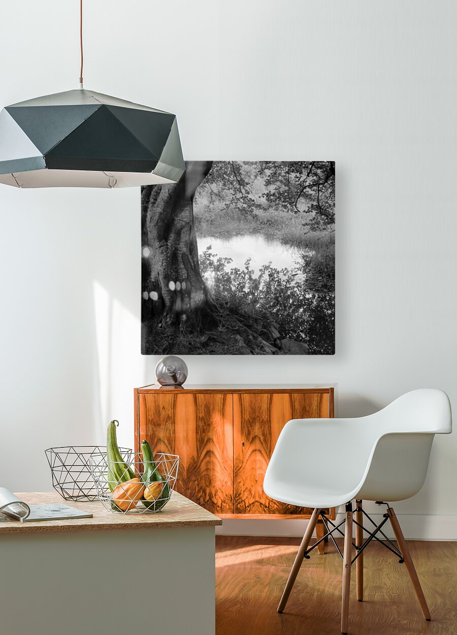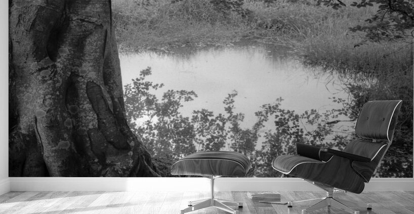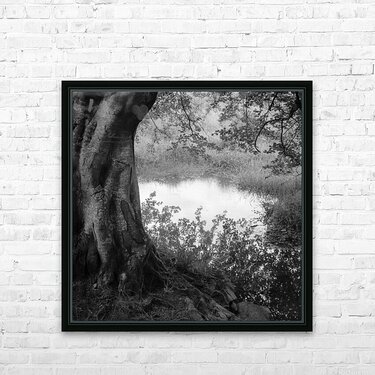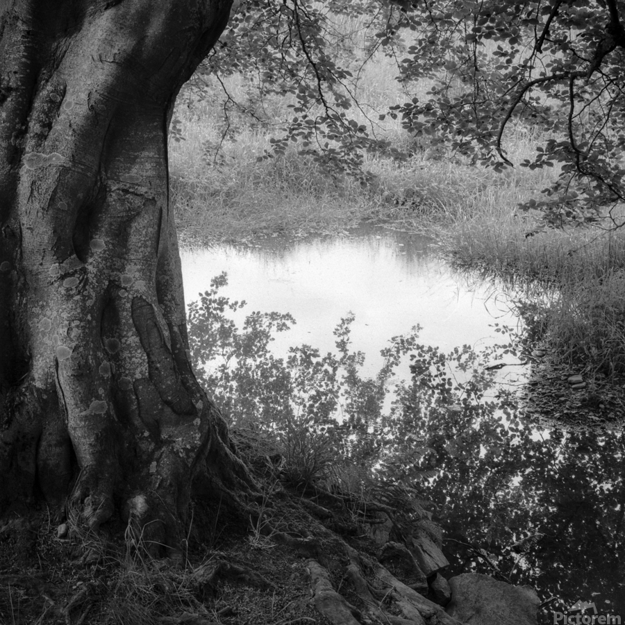 A monochrome photograph of the reflection of an overhanging tree’s branches in a quiet country pond in Aberdeenshire, Scotland, with the trunk of th...[+]