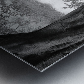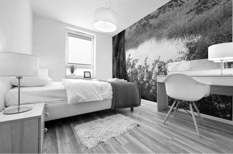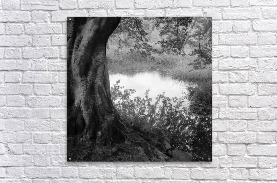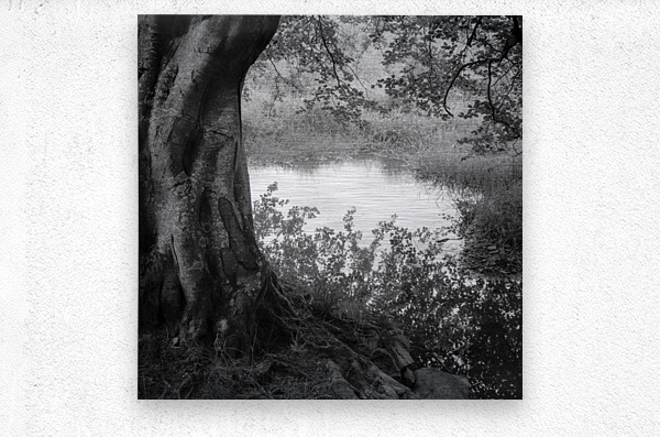 A monochrome photograph of the reflection of an overhanging tree’s branches in a quiet country pond in Aberdeenshire, Scotland, with the trunk of the tree visible in the foreground. The image captures the serene interaction between the tree's limbs and the still water, highlighting the intricate patterns created by the reflection. This black and white photo emphasizes the calm and reflective nature of the rural scene. A perfect photograph for those who appreciate detailed nature reflections or classic monochrome landscapes. ..... Please note: This image has a slightly grainy texture because it was photographed on analog film.
