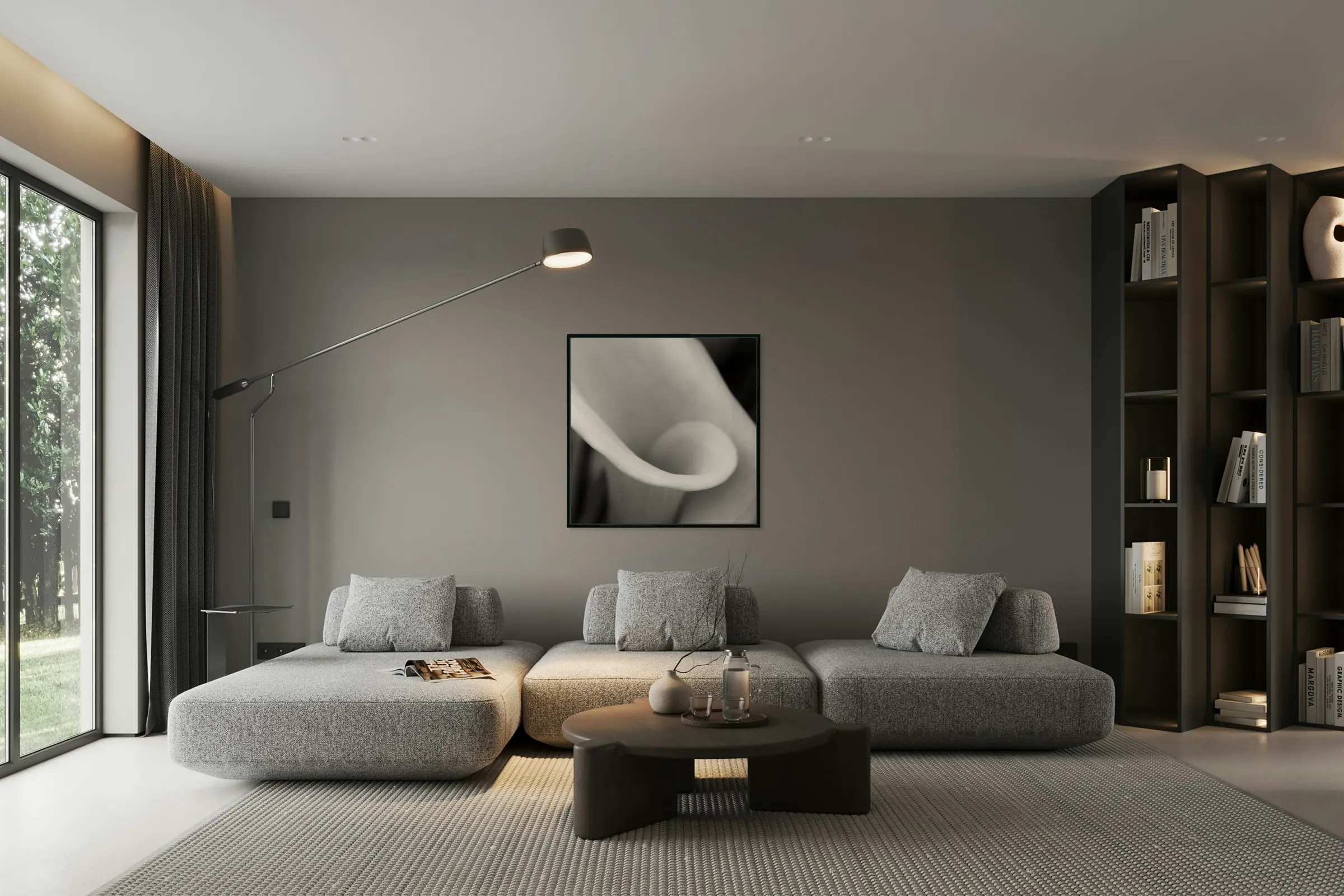 A monochrome semi-abstract close-up of the funnelled petals of a white calla lily, featuring intricate textures and subtle gradients. This detailed study captures the elegant curves and delicate structure of the flower, emphasizing its refined and minimalist beauty. The high-contrast black and white tones highlight the play of light and shadow on the smooth petals, creating a striking visual effect. A perfect photograph for those seeking a sophisticated and artistic addition to their collection.