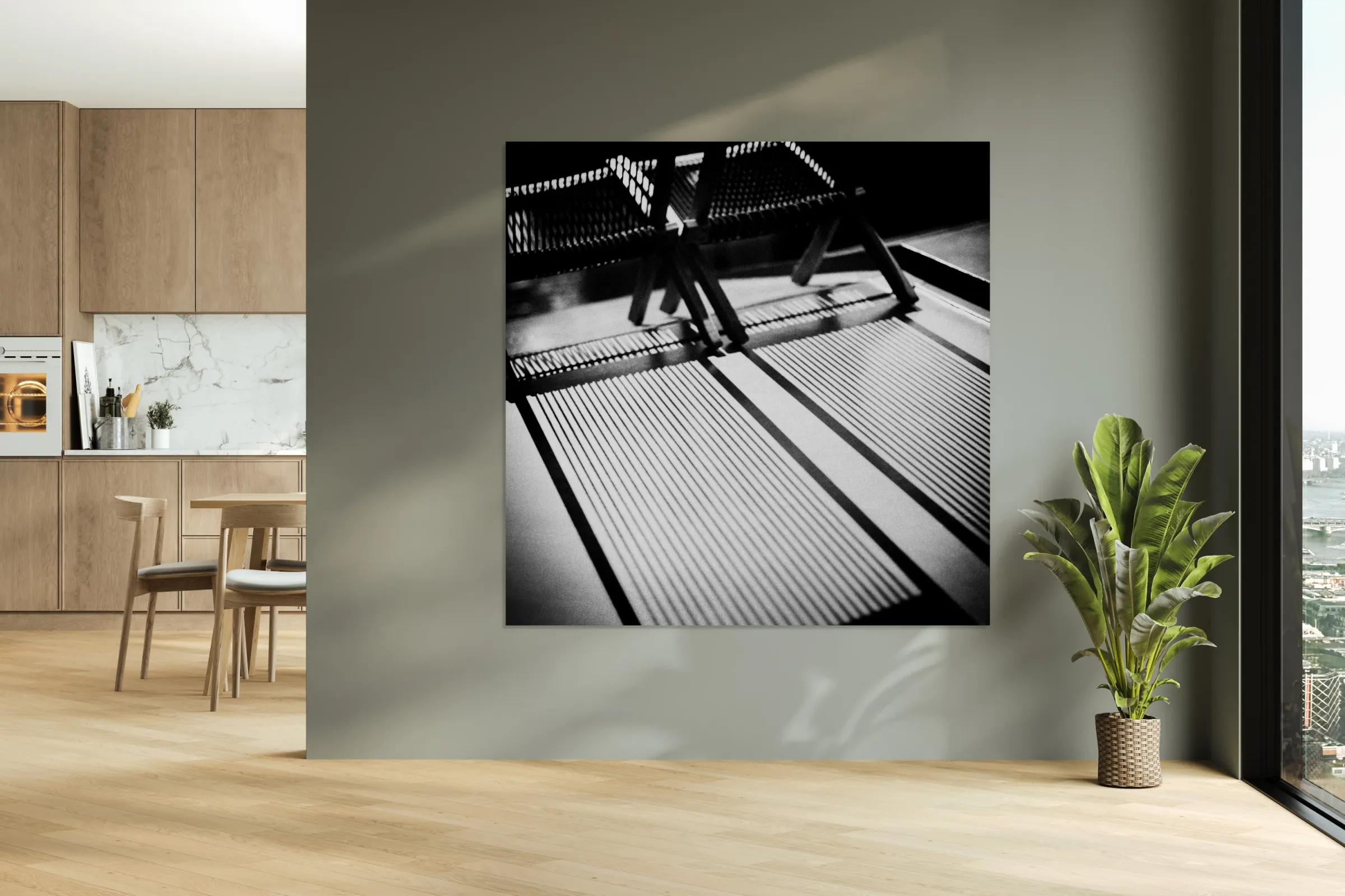 A semi-abstract monochrome photograph capturing deck chairs in the bright summer sun, casting intricate shadows across the top of a Dutch canal boat in Amsterdam. The interplay of light and shadow creates a compelling visual contrast, highlighting the unique textures and forms of the chairs against the boat's surface. This image encapsulates a moment of leisure and tranquility on the waterways of Amsterdam, while emphasizing the geometric patterns formed by natural sunlight. A great photograph for interior designers, art collectors, or anyone seeking a striking piece that evokes the relaxed atmosphere of a summer day in the heart of the city. ..... Please note: This image has a grainy texture which is intentional and part of the image aesthetic.