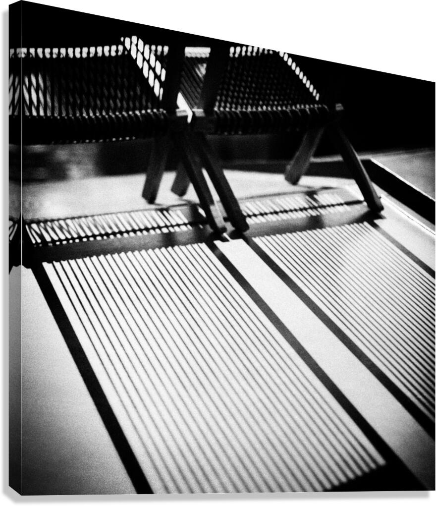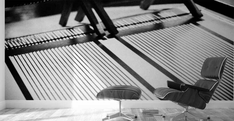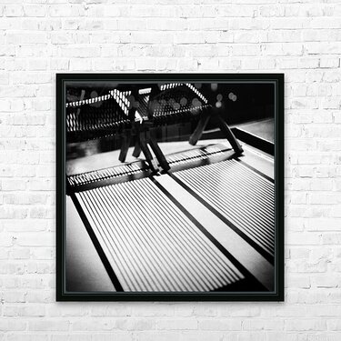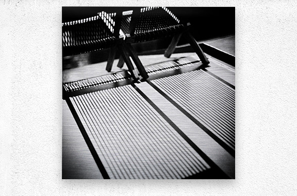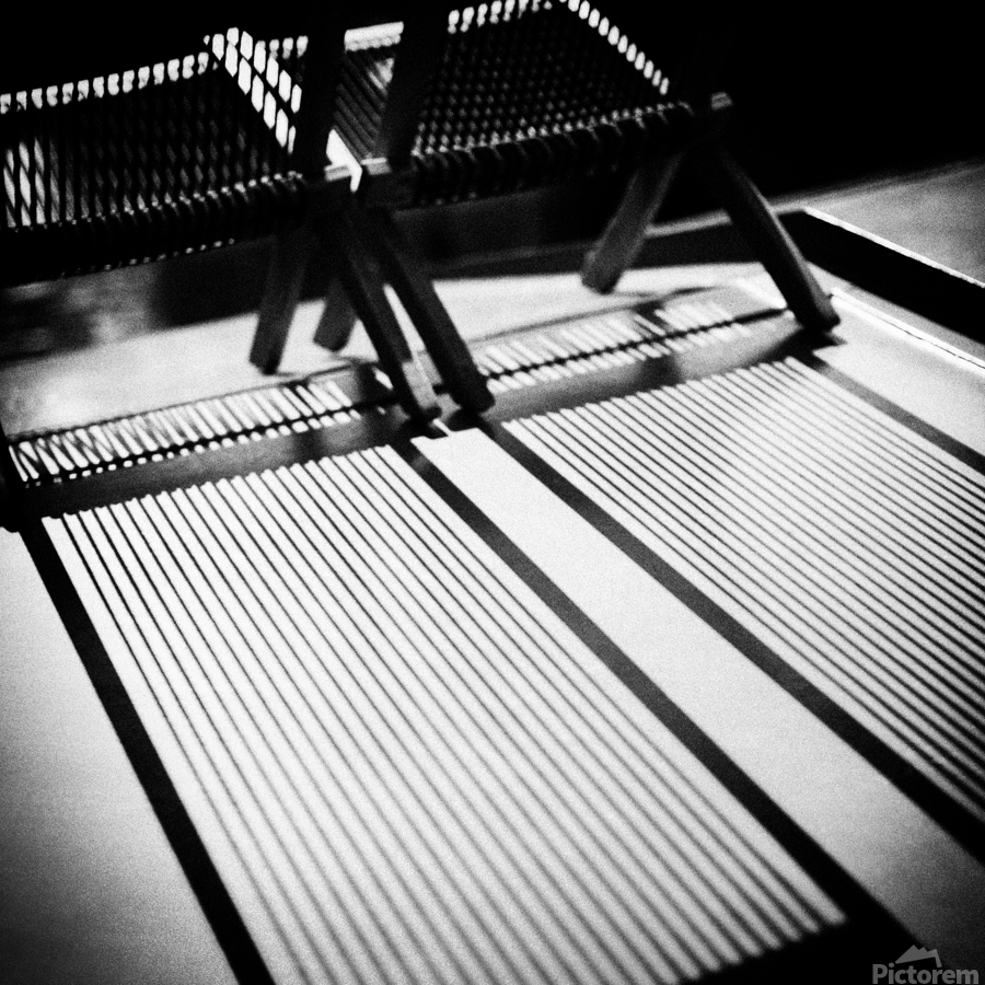 A semi-abstract monochrome photograph capturing deck chairs in the bright summer sun, casting intricate shadows across the top of a Dutch canal boat i...[+]