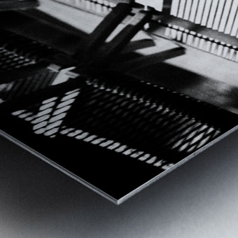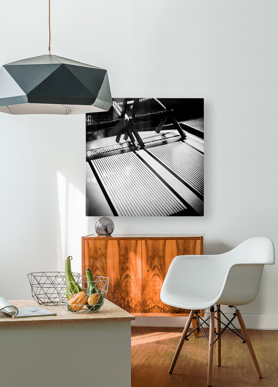 A semi-abstract monochrome photograph capturing deck chairs in the bright summer sun, casting intricate shadows across the top of a Dutch canal boat in Amsterdam. The interplay of light and shadow creates a compelling visual contrast, highlighting the unique textures and forms of the chairs against the boat's surface. This image encapsulates a moment of leisure and tranquility on the waterways of Amsterdam, while emphasizing the geometric patterns formed by natural sunlight. A great photograph for interior designers, art collectors, or anyone seeking a striking piece that evokes the relaxed atmosphere of a summer day in the heart of the city. ..... Please note: This image has a grainy texture which is intentional and part of the image aesthetic.