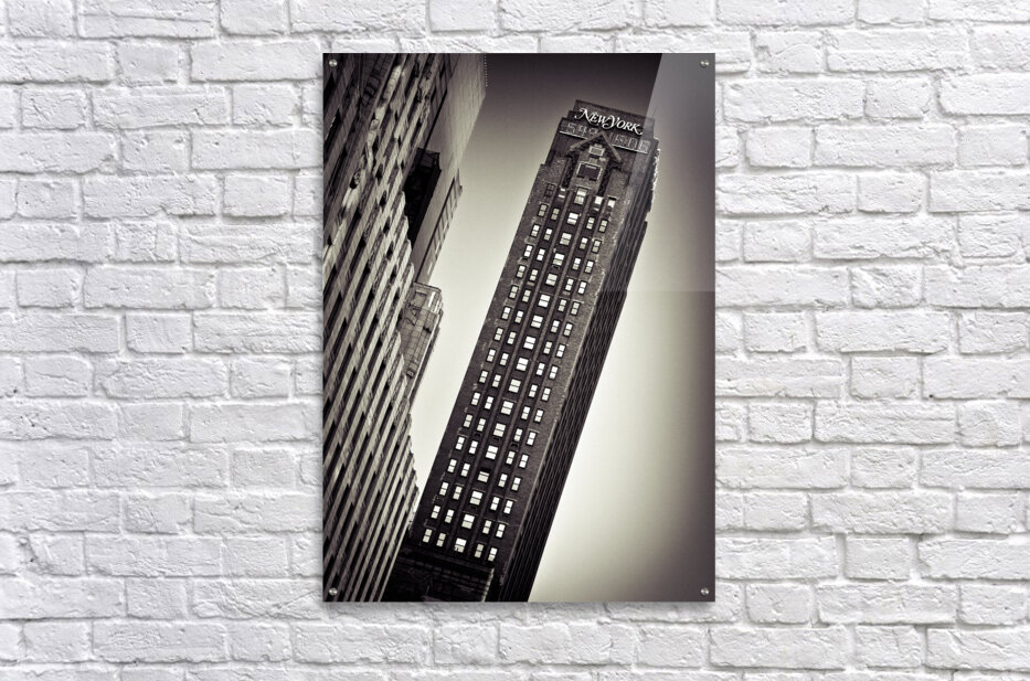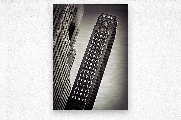 A monochrome photograph capturing the iconic Newsweek building in Manhattan, New York, highlighting its architectural details and historic significance. The black and white tones accentuate the structure's bold lines and urban character, reflecting the dynamic essence of Midtown Manhattan. This image offers a timeless perspective of a prominent New York landmark, ideal for those interested in classic urban photography or the architectural landscape of New York City. A perfect photograph for art collectors, interior designers, or anyone seeking a distinctive piece that embodies the spirit of New York architecture.