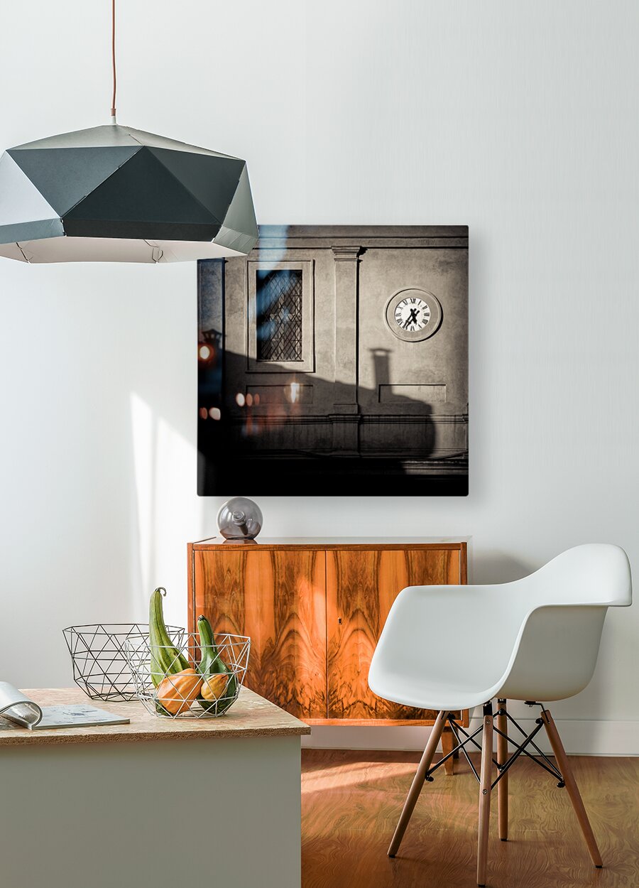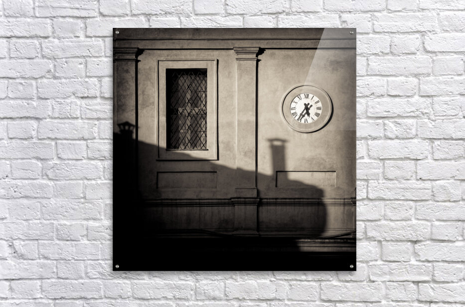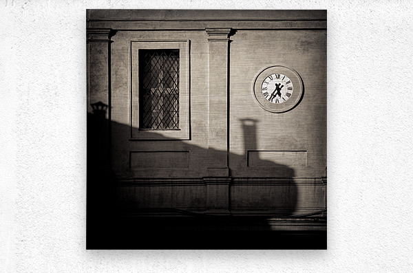A monochrome photograph capturing the setting sun casting long shadows across the side of a rustic building in a quiet Siena side street in Tuscany, Italy. The building features a prominent wall clock showing 5:35 pm. The textured surfaces and architectural elements of the historic building come alive in monochrome, evoking a sense of timelessness and serenity in a Tuscan setting. A great photograph for those who appreciate fine art photography, rustic Italian architecture, or are looking to add a piece of Tuscany’s charm to their home or office.