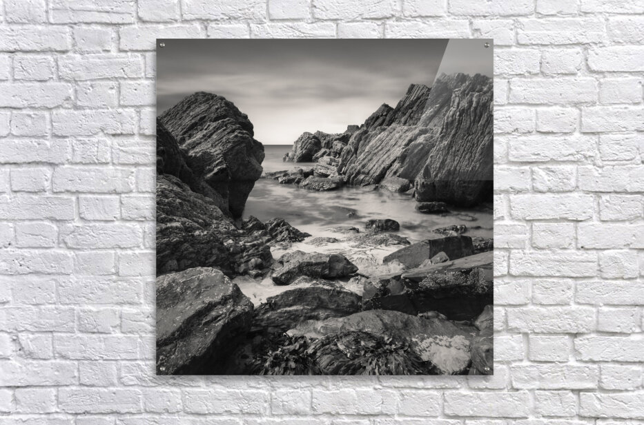 A monochrome, long exposure photograph of Marloes Sands in Pembrokeshire, South Wales. This image features a rugged, rocky beach with a smooth, serene sea and softly blurred clouds in the sky. The long exposure captures the detailed textures of the rocks and the serene quality of the calm sea, creating a dramatic yet tranquil seascape. A great photograph for collectors of detailed coastal scenery and dramatic black-and-white imagery.