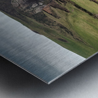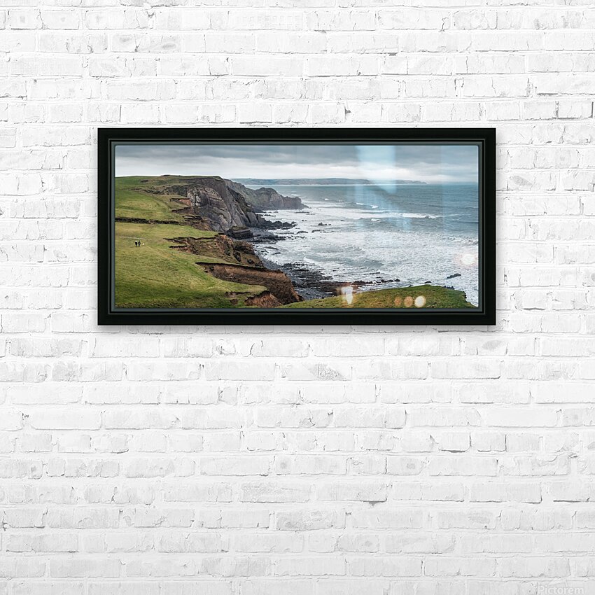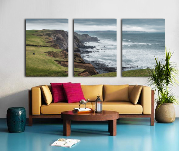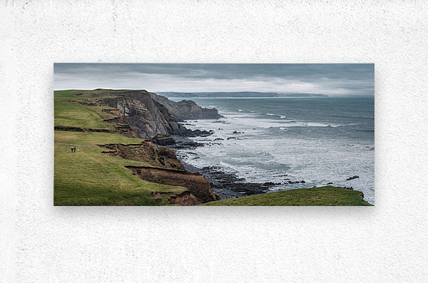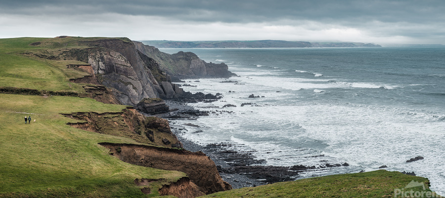 A panoramic view of Sandymouth Cliffs in Cornwall captures the rugged coastal landscape with a couple walking their dog along the cliff tops, framed by the dramatic backdrop of a turbulent sea below. The sweeping shot showcases the natural beauty of the Cornish coastline, highlighting the contrasting textures of the rocky cliffs and the churning waters. A great photograph for those seeking imagery of Cornwall’s coastal scenery, nature enthusiasts, or anyone looking to bring a sense of adventure and the outdoors into their home or office space.
