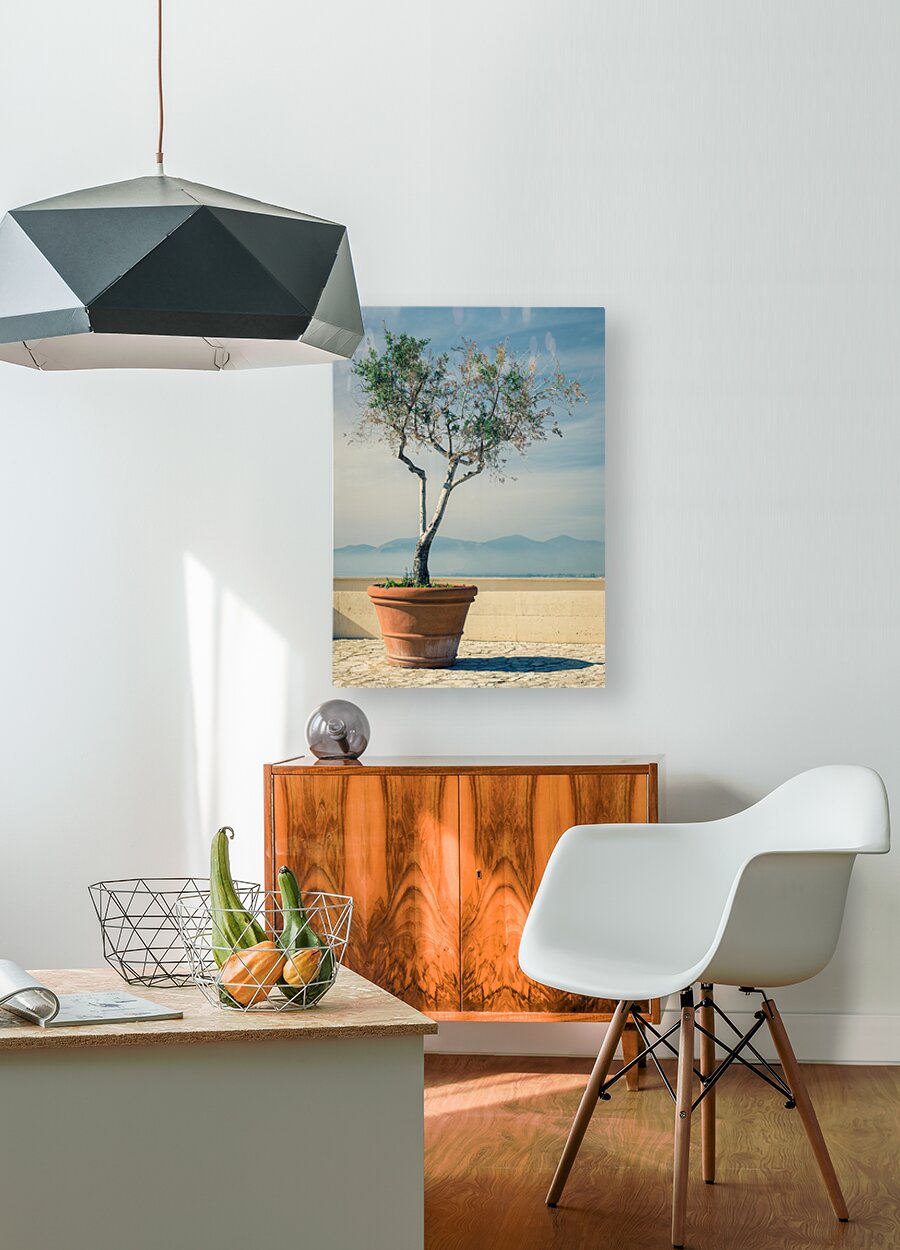 A young olive tree in a terracotta pot sits prominently in the foreground, framed against the backdrop of the rugged Amalfi Coast mountains in Italy. The lush green leaves of the tree contrast with the warm, earthy tones of the terracotta pot, creating a serene Mediterranean scene. In the distance, the majestic peaks of the Amalfi Coast rise under a clear sky, capturing the essence of coastal Italy's natural beauty. A perfect photograph for home or office decor, travel enthusiasts, or anyone seeking a touch of Italian countryside charm in their space.
