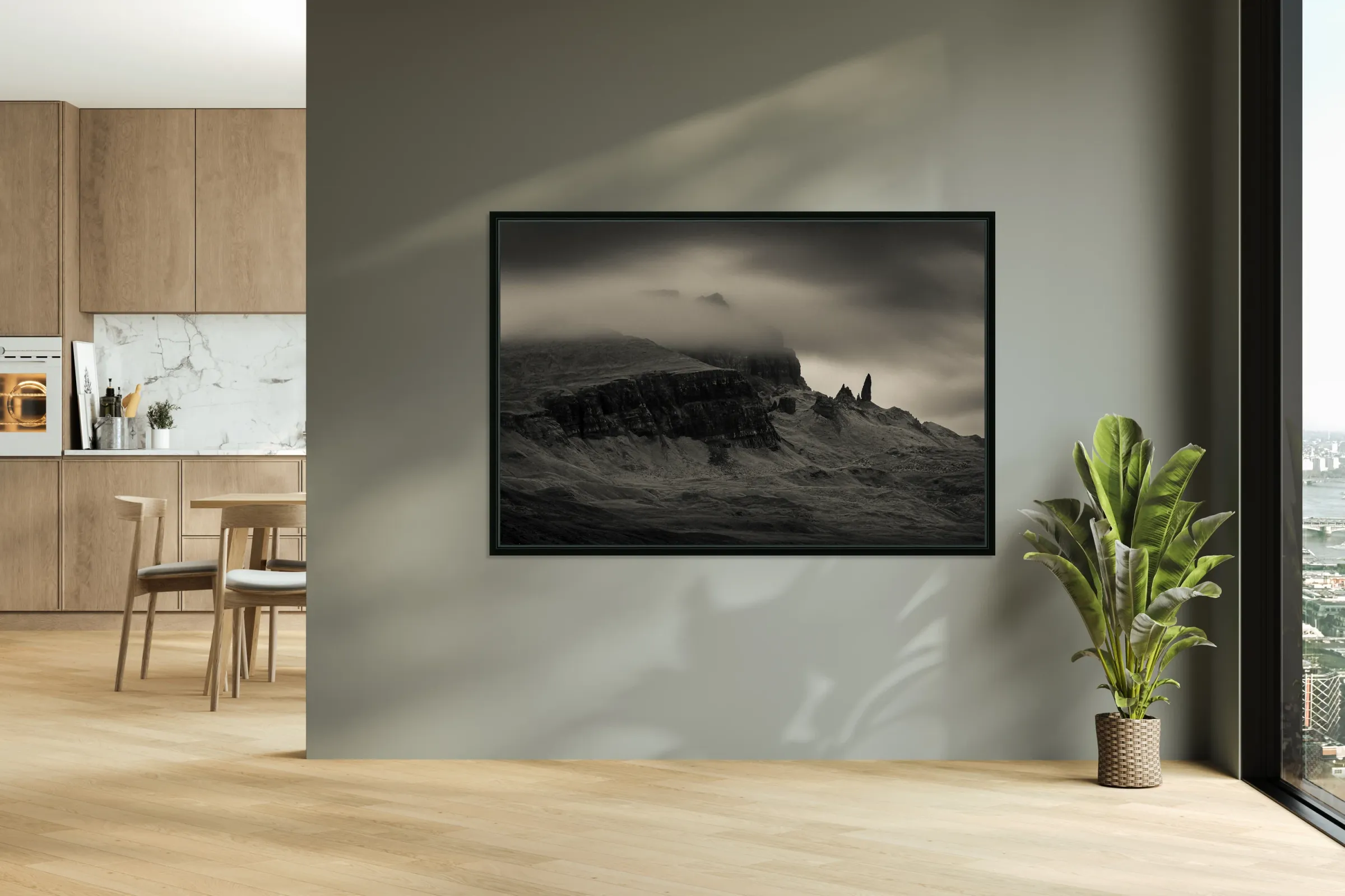 A monochrome, long exposure photograph capturing the dramatic landscape of the Old Man of Storr from Loch Fada on a moody day in the Isle of Skye, Inner Hebrides of Scotland. The image highlights the iconic rock formation and rugged terrain under brooding skies, creating a sense of depth and timelessness. The long exposure softens the clouds, adding a serene contrast to the stark, jagged peaks of the Old Man of Storr. A perfect photograph for landscape enthusiasts, collectors of Scottish scenery, or anyone seeking a striking, atmospheric piece of art that embodies the wild beauty of the Isle of Skye.