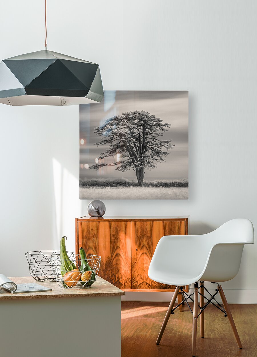 A monochrome, infrared, long exposure photograph of a majestic cedar tree at Llansteffan, Carmarthenshire, Wales. The infrared technique gives the tree an ethereal, otherworldly quality, set against a sky streaked with clouds captured in soft, flowing motion from the long exposure. The combination of infrared and monochrome enhances the contrast between the delicate, glowing foliage and the dynamic sky, creating a serene and timeless scene. A perfect photograph for fine art collectors, landscape photography enthusiasts, or anyone seeking unique, atmospheric wall art to elevate their space.